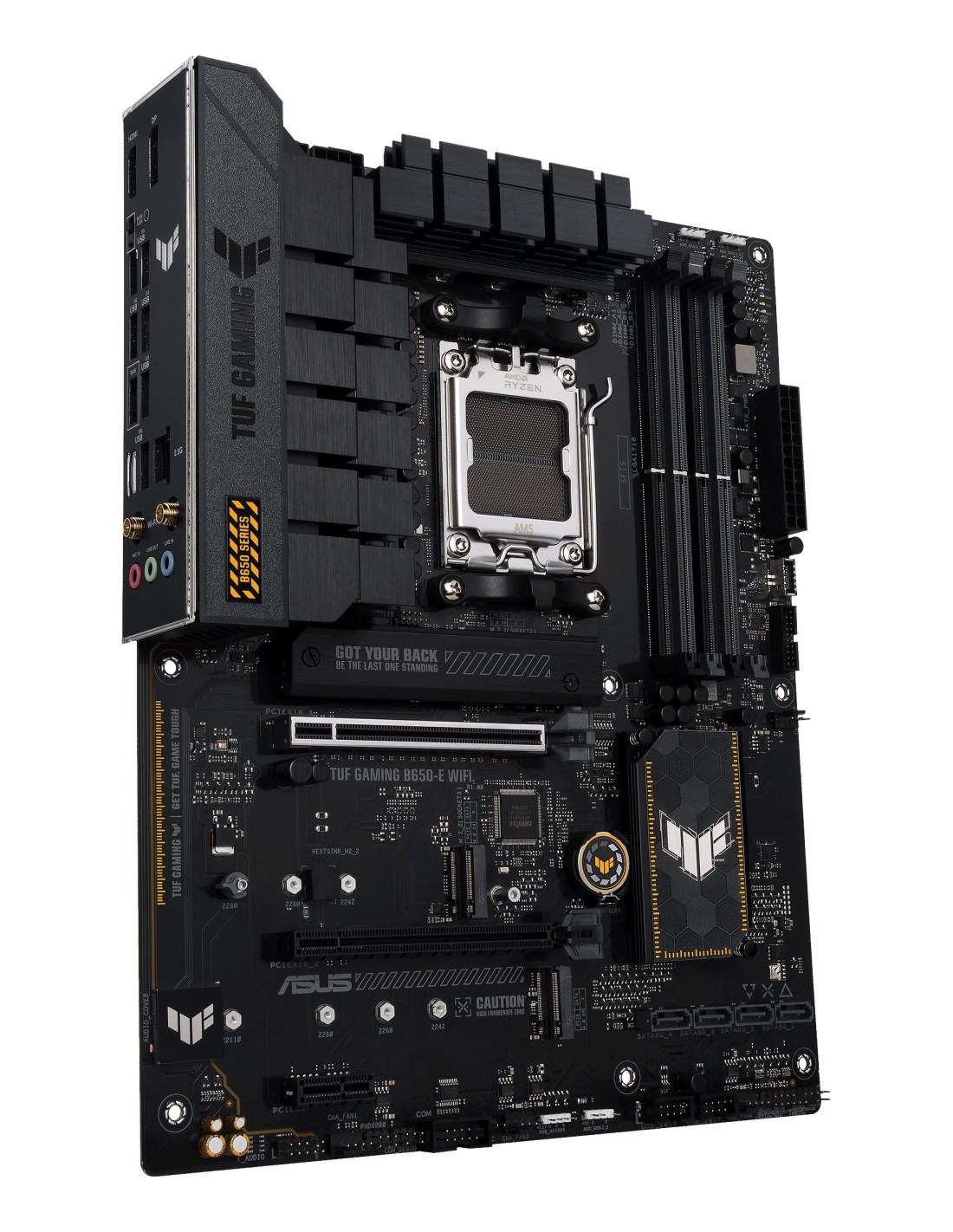 ASUS TUF GAMING B650-E WIFI. Fabricante de procesador: AMD, Socket de procesador: Zócalo AM5, Sockets de procesador soportados: Zócalo AM5. tipos de memoria compatibles: DDR5-SDRAM, Memoria interna máxima: 192 GB, Tipo de ranuras de memoria: DIMM. Interfaces de disco de almacenamiento soportados: M.2, SATA III, Tipos de unidades de almacenamiento admitidas: HDD & SSD, Niveles RAID: 0, 1, 10. Tipo de interfaz ethernet: 2.5 Gigabit Ethernet, Estándar Wi-Fi: Wi-Fi 6E (802.11ax), Wi-Fi estándares: 802.11a, 802.11b, 802.11g, Wi-Fi 4 (802.11n), Wi-Fi 5 (802.11ac), Wi-Fi 6 (802.11ax), Wi-Fi 6E.... Componente para: PC, Factor de forma: ATX, Familia del chipset: AMD