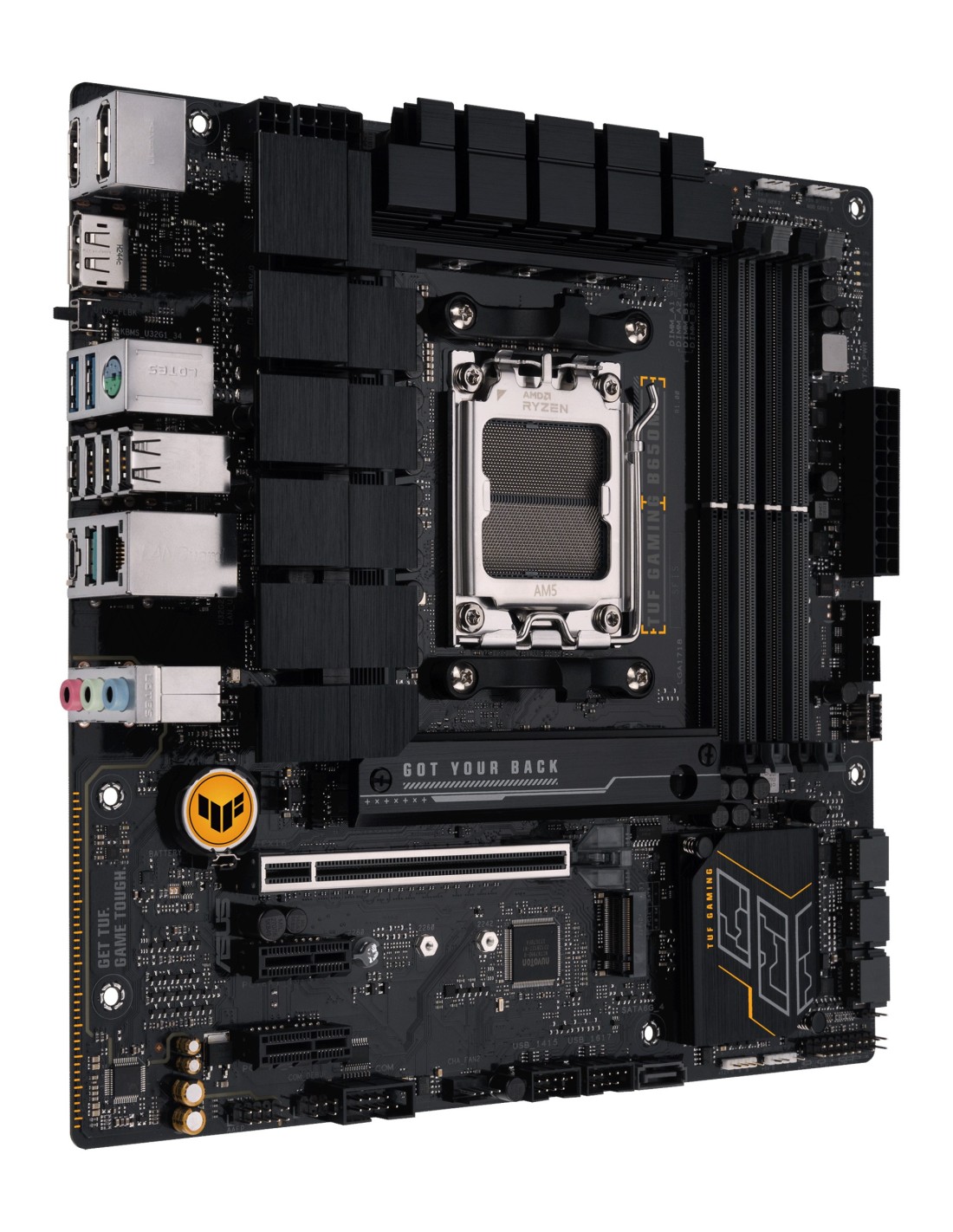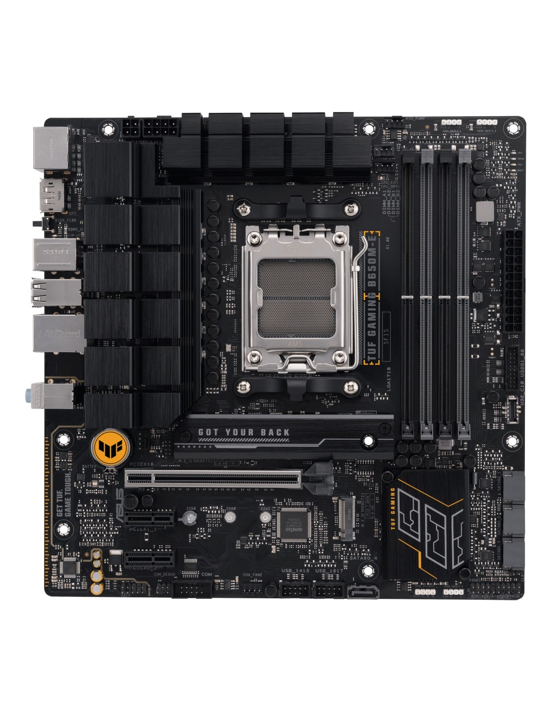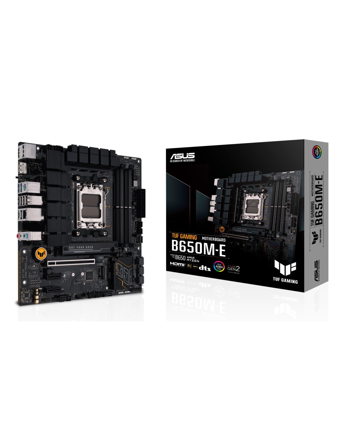 ASUS TUF GAMING B650M-E. Fabricante de procesador: AMD, Socket de procesador: Zócalo AM5, Procesador compatible: AMD Ryzen 7000 Series. tipos de memoria compatibles: DDR5-SDRAM, Memoria interna máxima: 128 GB, Tipo de ranuras de memoria: DIMM. Interfaces de disco de almacenamiento soportados: M.2, SATA III, Tipos de unidades de almacenamiento admitidas: HDD & SSD, Niveles RAID: 0, 1, 10. Tipo de interfaz ethernet: 2.5 Gigabit Ethernet. Componente para: PC, Factor de forma: micro ATX, Familia del chipset: AMD