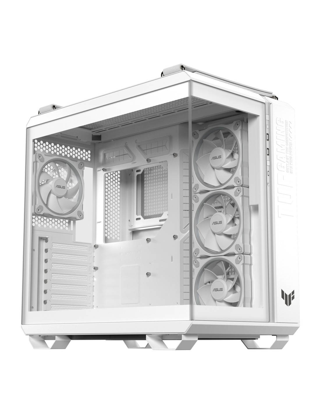 ASUS TUF GAMING GT502 Horizon TG ARGB White. Factor de forma: Midi Tower, Tipo: PC, Color del producto: Blanco. Ventiladores laterales instalados: 3x 120 mm, Ventiladores traseros instalados: 1x 120 mm, Diámetro de ventiladores traseros soportados: 120 mm. Tamaños de disco duro soportados: 2.5,3.5". Ancho: 285 mm, Profundidad: 450 mm, Altura: 446 mm. Ancho del paquete: 380 mm, Profundidad del paquete: 525 mm, Altura del paquete: 557 mm