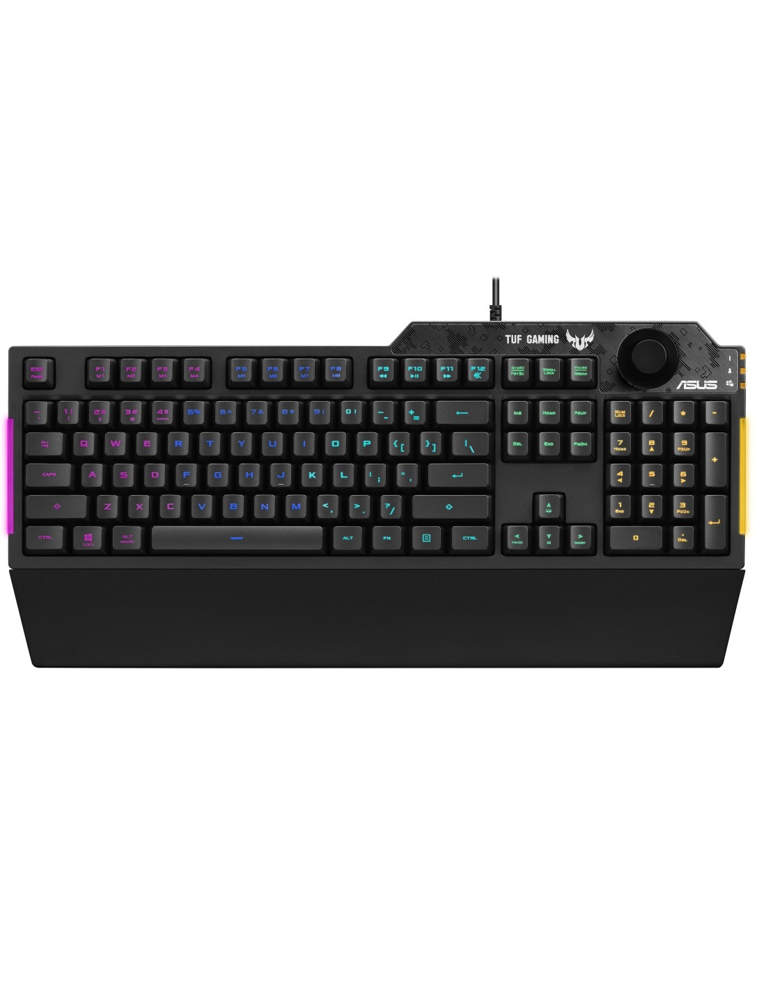 ASUS TUF Gaming K1. Formato del teclado: Completo (100%). Estilo de teclado: Derecho. Tecnología de conectividad: Alámbrico, Interfaz del dispositivo: USB, Interruptor del teclado: Interruptor de membrana. Tipo de retroiluminación: LED RGB, Descansa muñecas. Longitud de cable: 1,8 m. Uso recomendado: Juego. Color del producto: Negro