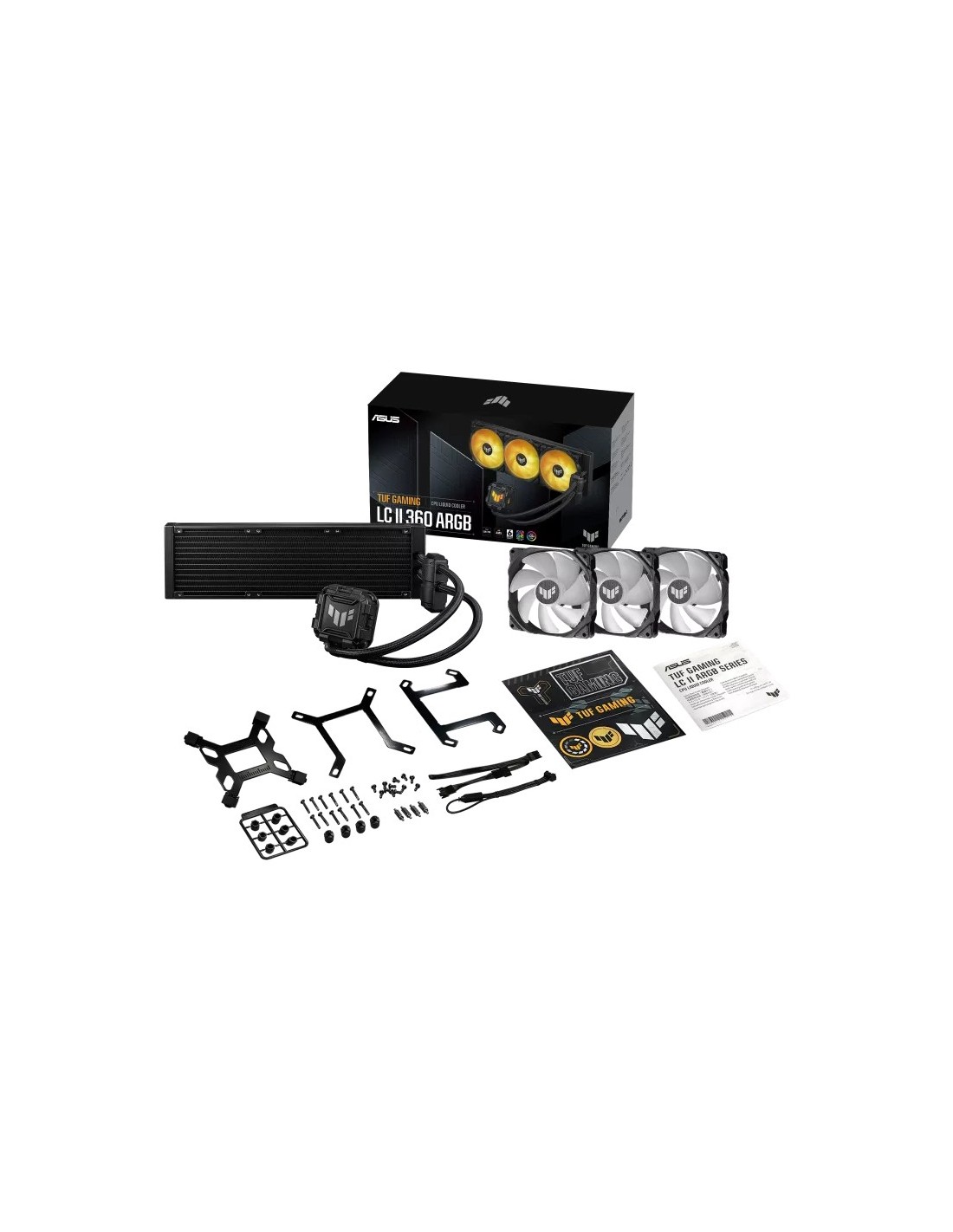ASUS TUF GAMING LC II 360 ARGB. Tipo: Kit de refrigeración líquida, Diámetro de ventilador: 12 cm, Velocidad de rotación (mín.): 800 RPM, Velocidad de rotación (máx.): 2000 RPM, flujo de aire: 113,8 m³/h, Presión máxima de aire: 3 mmH2O. Color del producto: Negro