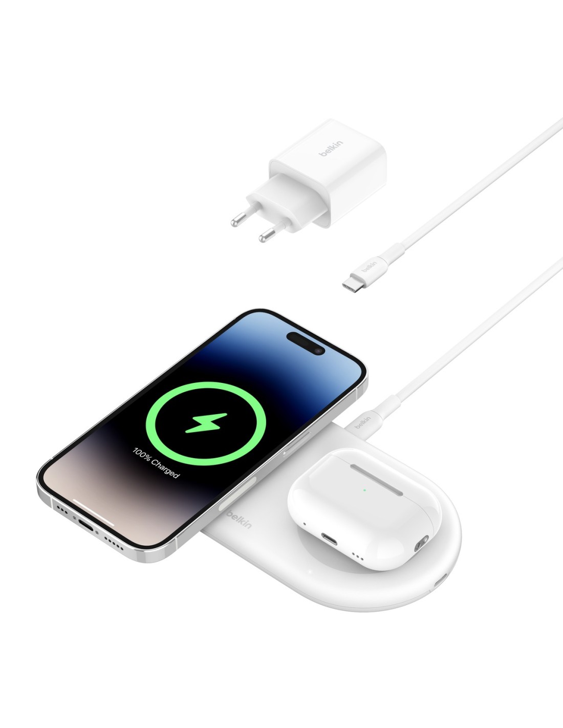Belkin WIZ021vfWH. Tipo: Independiente, Material: Plástico, Color del producto: Blanco. Potencia de carga inalámbrica: 15 W. Cables incluidos: USB Tipo C, Cantidad por paquete: 1 pieza(s). Periodo de garantía: 2 año(s)