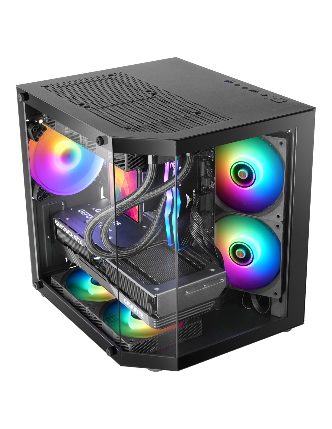 Su diseño panorámico MicroATX compacto con triple cristal templado continuo, estructura de doble cámara y gran capacidad interna te permite mostrar tu hardware con estilo y mantener un rendimiento térmico sobresaliente. Con ventilador trasero FRGB incluido, soporte para hasta 7 ventiladores y refrigeraciones líquidas de hasta 240 mm, está lista para cualquier desafío en el menor espacio