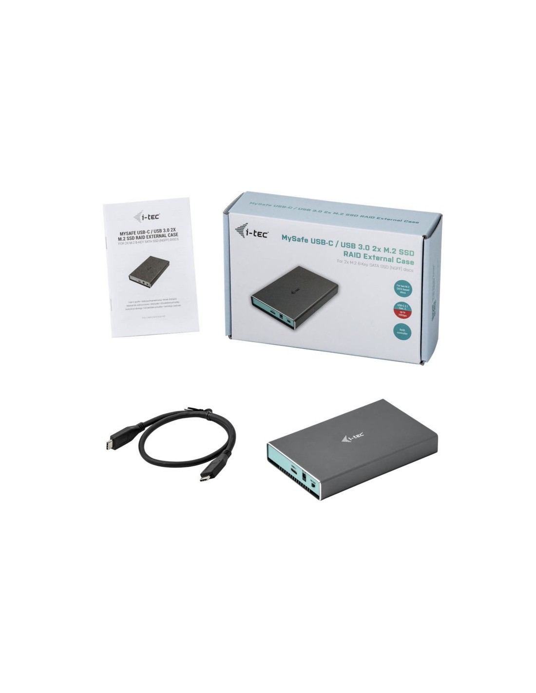 i-tec MySafe USB 3.0 / USB-C 3.1 Gen. 2 Caja de dos bahías. Tipo de producto: Caja externa para unidad de estado sólido (SSD). Número de unidades de almacenamiento compatibles: 2, Tamaño de la unidad de almacenamiento: M.2, Interfaces de disco de almacenamiento soportados: Serial ATA III. Velocidad de transferencia de datos: 10 Gbit/s. Niveles RAID: 0, 1, JBOD. Color del producto: Aluminio. Conector USB: USB Tipo C