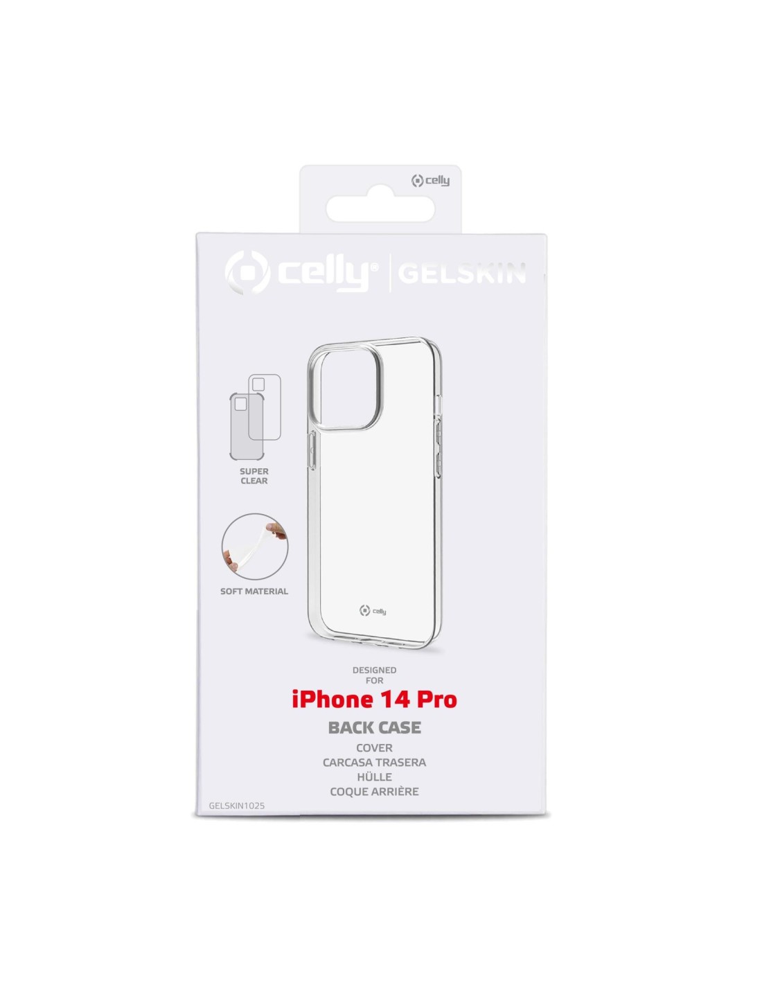 Celly Gelskin. Tipo de funda: Funda, Marca compatible: Apple, Compatibilidad: iPhone 14 Pro, Tamaño máximo de pantalla: 15,5 cm (6.1"), Coloración de superficie: Monocromo, Color del producto: Transparente