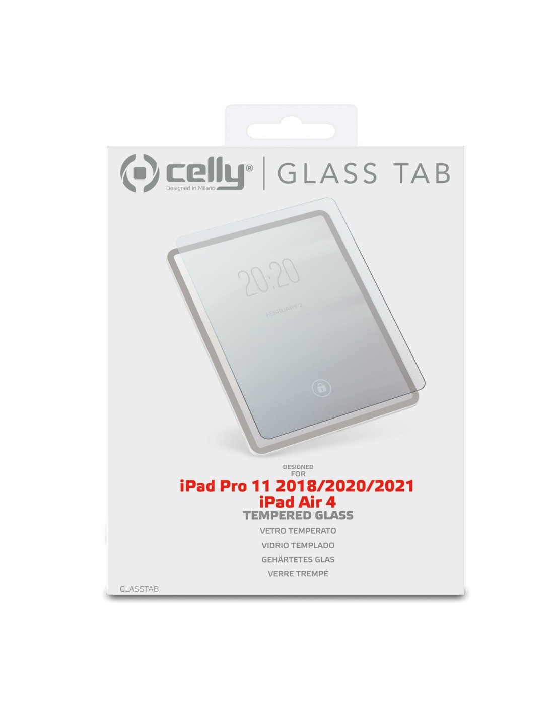 Celly GLASSTAB. Tipo de protector de pantalla: Protector de pantalla, Tamaño máximo de pantalla: 27,7 cm (10.9"), Material: Vidrio templado, Dureza: 9H, Marca compatible: Apple, Compatibilidad: iPad Pro 11 2018/ 2020/ 2021 iPad Air 4 iPad 10.9 2020. Cantidad por paquete: 1 pieza(s)
