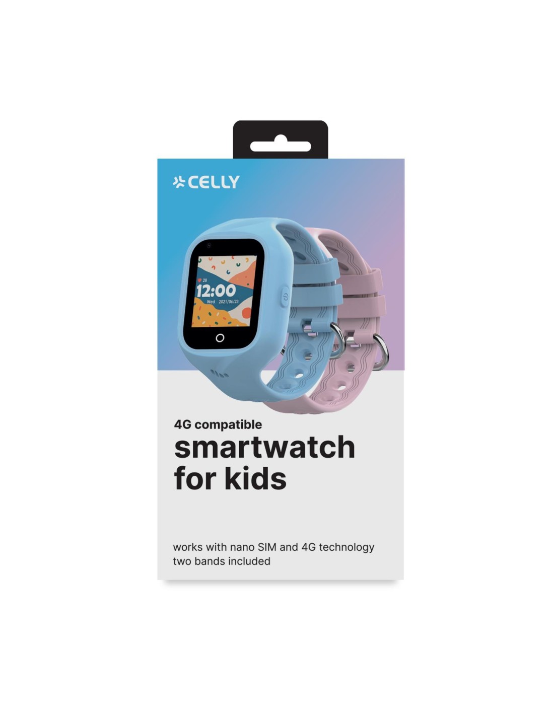Celly KIDSWATCH4G. Diagonal de la pantalla: 3,56 cm (1.4"), Pantalla táctil. Capacidad de RAM: 128 MB, Memoria flash: 0,196 GB. GPS (satélite). Capacidad de batería: 700 mAh. Peso: 50 g. Material de la banda: Silicona, Color de banda: Azul, Rosa
