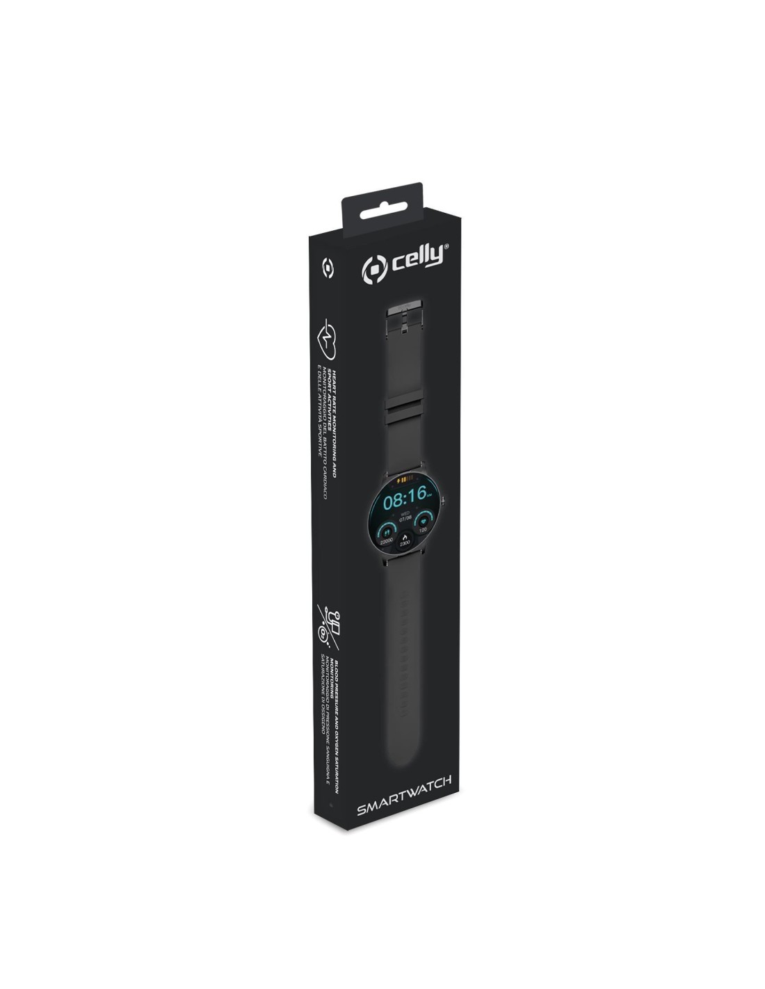 Celly TRAINERROUND2BK. Diagonal de la pantalla: 3,25 cm (1.28"), Resolución de la pantalla: 320 x 320 Pixeles, Pantalla táctil. GPS (satélite). Capacidad de batería: 230 mAh. Peso: 36 g. Color de banda: Negro
