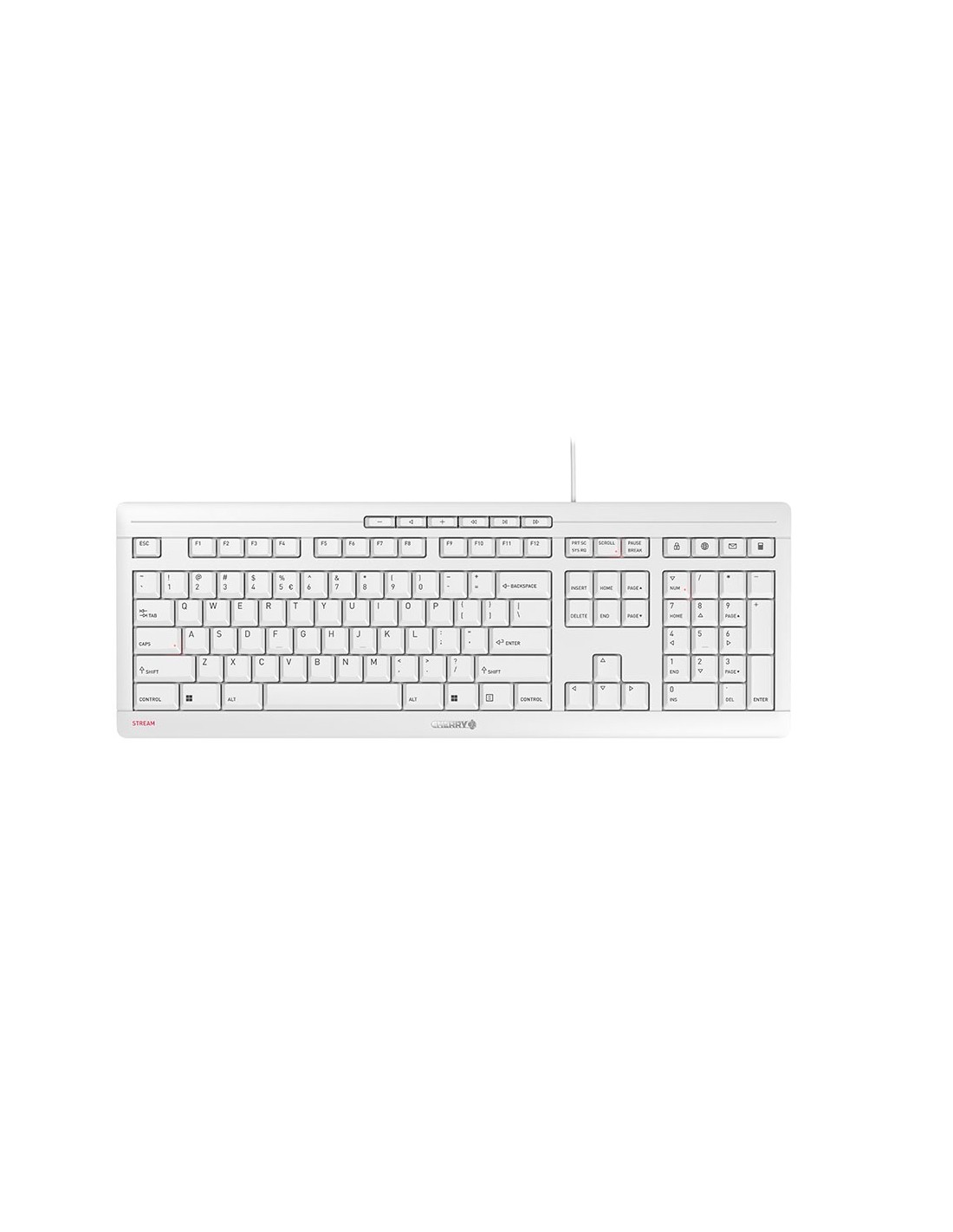CHERRY STREAM. Formato del teclado: Completo (100%). Estilo de teclado: Derecho. Tecnología de conectividad: Alámbrico, Interfaz del dispositivo: USB, Interruptor del teclado: Interruptor mecánico, Diseño de teclado: QWERTY, Teclado, cantidad de teclas: 104. Longitud de cable: 1,8 m. Uso recomendado: Oficina. Color del producto: Blanco