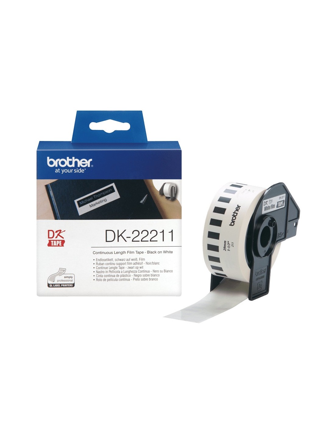 Brother DK-22211. Color de etiqueta: Negro sobre blanco, Etiquetas por rollo: 1 pieza(s), Tipo de cinta: DK. Ancho de cinta: 2,9 cm, Longitud de cinta: 15,24 m, Ancho: 54 mm. Altura del palé: 17,4 cm, Número de cajas de cartón por palé: 40 pieza(s), Número de capas por palé: 10 pieza(s)