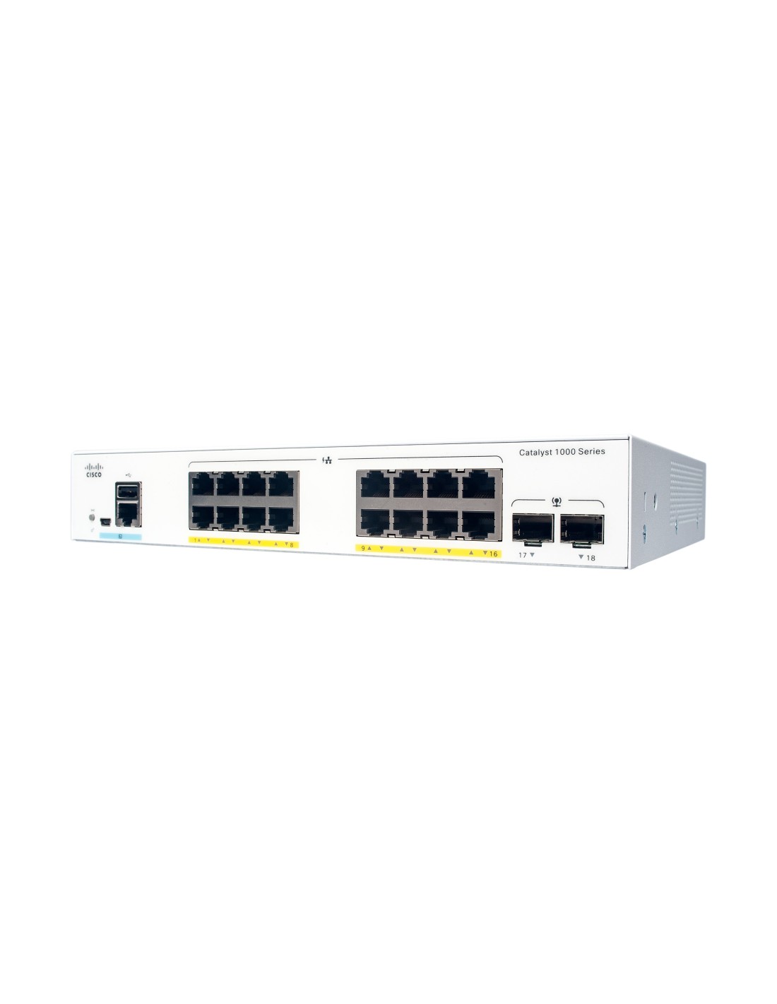 Cisco Catalyst C1000-16P-2G-L. Tipo de interruptor: Gestionado, Capa del interruptor: L2. Puertos tipo básico de conmutación RJ-45 Ethernet: Gigabit Ethernet (10/100/1000), Cantidad de puertos básicos de conmutación RJ-45 Ethernet: 16, Cantidad de puertos USB 2.0: 1, Puerto de consola: RJ-45/Mini-USB. Tabla de direcciones MAC: 16000 entradas, Capacidad de conmutación: 36 Gbit/s. Estándares de red: IEEE 802.1AX, IEEE 802.1D, IEEE 802.1Q, IEEE 802.1ab, IEEE 802.1p, IEEE 802.1s, IEEE 802.1w, IEEE.... Energía sobre Ethernet (PoE)