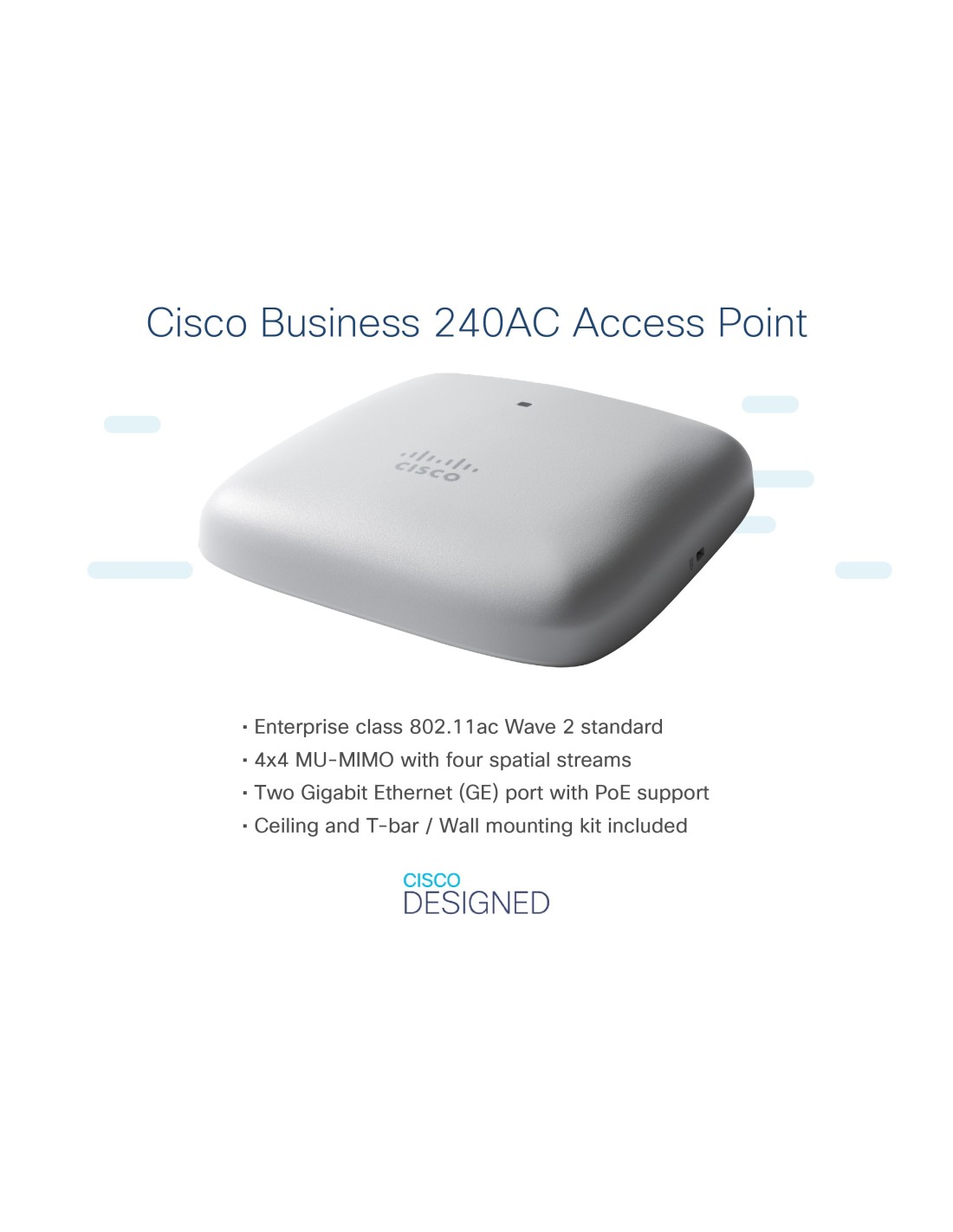 Cisco CBW240AC, 2,4 GHz, 5 GHz, 1733 Mbit/s, WPA, WPA2, WPA3, WPA2-Enterprise, 10,100,1000 Mbit/s