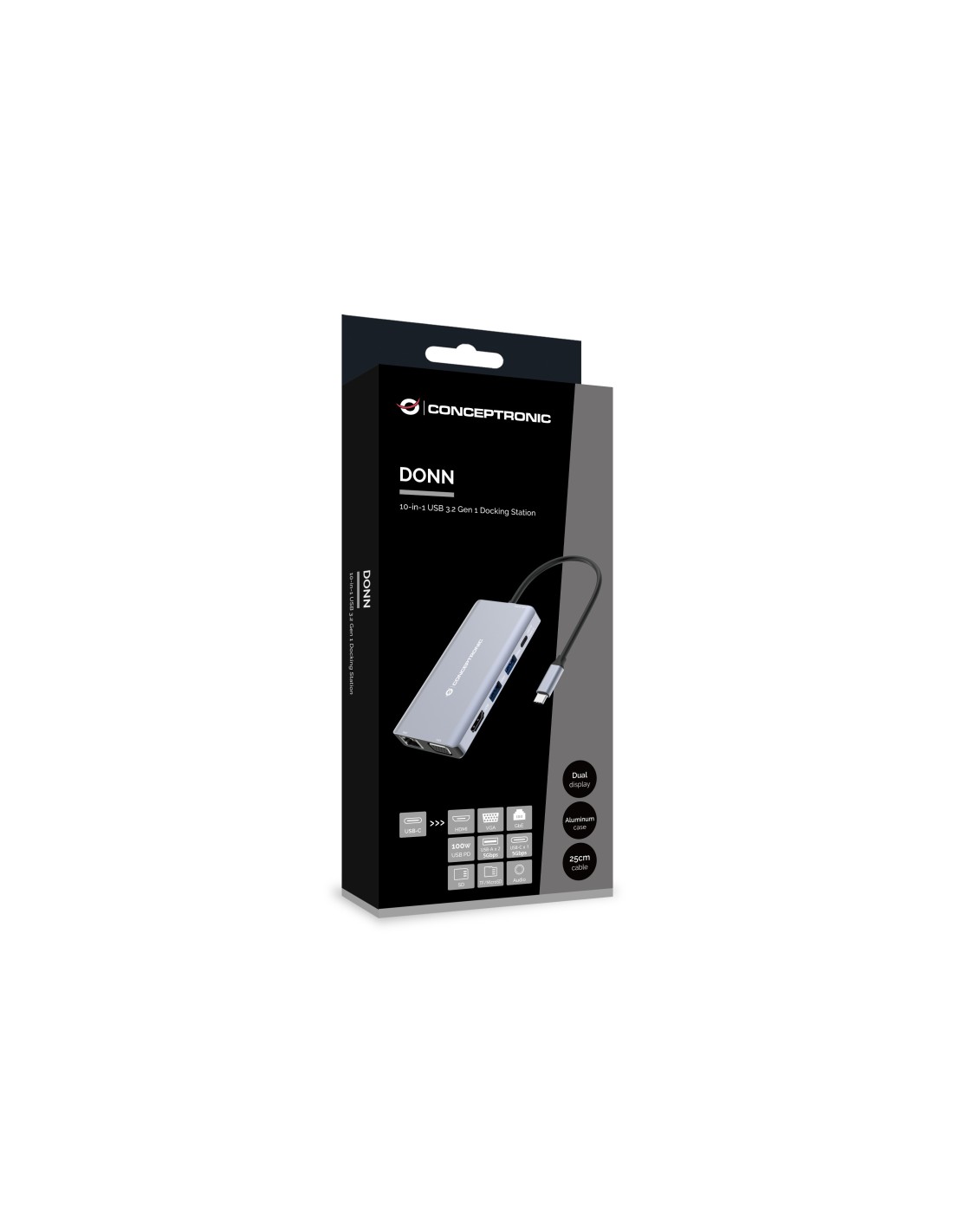 Conceptronic DONN20G. Tecnología de conectividad: Alámbrico, Interfaz de host: USB 3.2 Gen 1 (3.1 Gen 1) Type-C, Entrega de energía USB (USB Power Delivery) de hasta: 100 W. Ethernet LAN, velocidad de transferencia de datos: 10,100,1000 Mbit/s. Color del producto: Gris, Tarjetas de memoria compatibles: MicroSD (TransFlash), MicroSDHC, MicroSDXC, SD, SDHC, SDXC, Tipo HD: 4K Ultra HD. Alimentación: USB, Longitud del cable USB: 0,25 m. Sistema operativo Windows soportado: Windows 10, Windows 10 Education, Windows 10 Education x64, Windows 10 Enterprise, Windows 10..., Sistema operativo MAC soportado: Mac OS X 10.10 Yosemite, Mac OS X 10.11 El Capitan, Mac OS X 10.12 Sierra, Mac OS X 10.13 High..., Sistemas operativos móviles soportados: Android 10.0, Android 11.0, Android 12.0, Android 13.0, Android 5.0, Android 5.1, Android 6.0,...