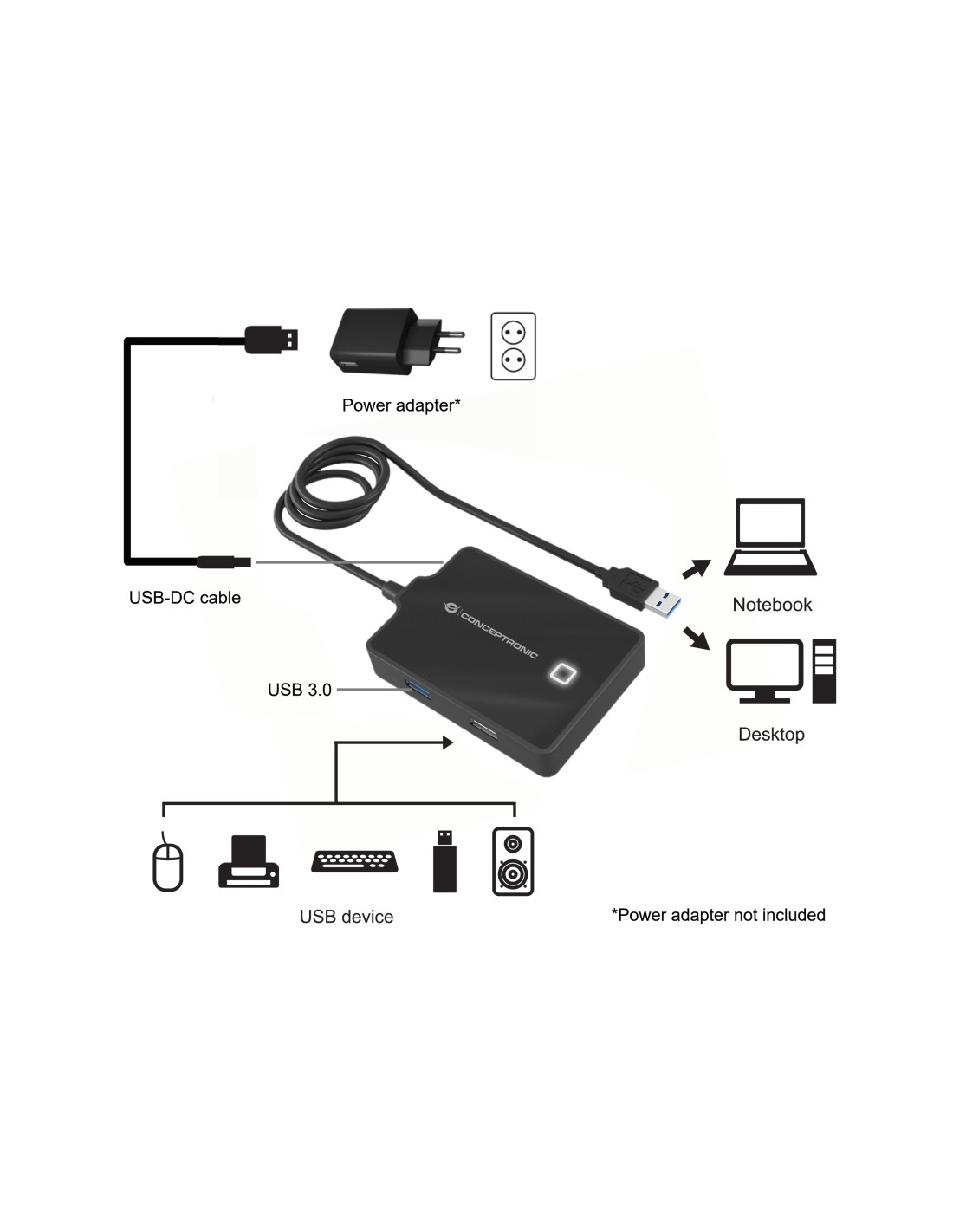 Conceptronic HUBBIES10B, USB 3.2 Gen 1 (3.1 Gen 1) Type-A, Negro, USB 2.0, USB 3.2 Gen 1 (3.1 Gen 1) Type-A, China, 87 mm, 55 mm