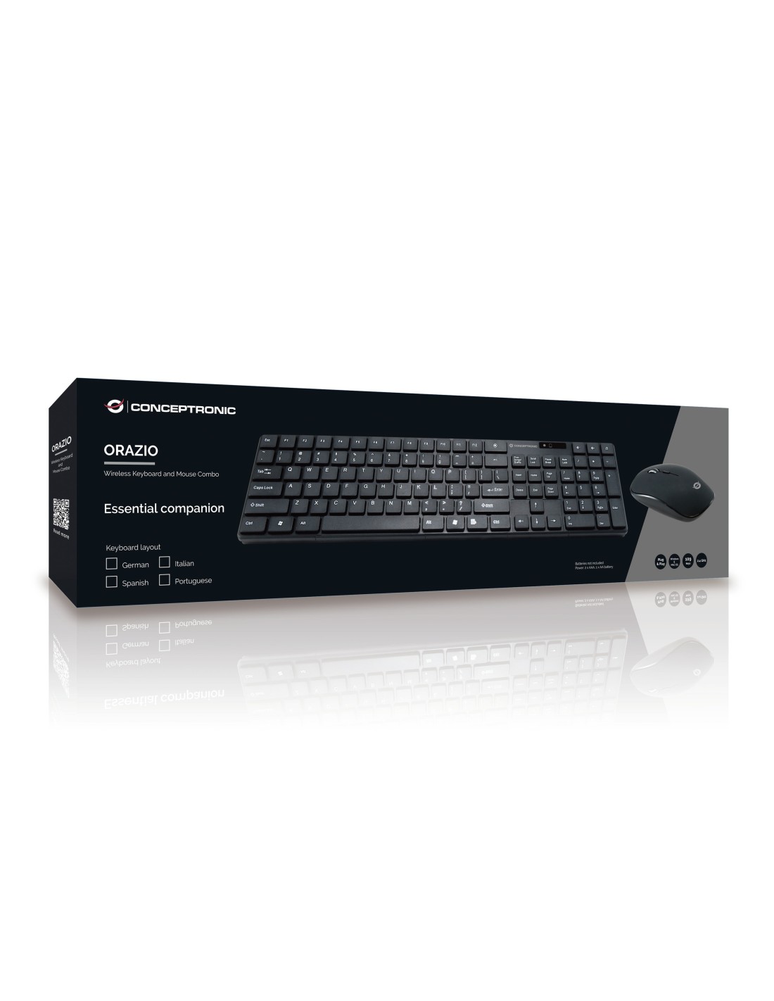 Conceptronic ORAZIO01DE. Formato del teclado: Completo (100%). Estilo de teclado: Derecho. Tecnología de conectividad: Inalámbrico, Interfaz del dispositivo: RF inalámbrico, Diseño de teclado: QWERTZ, Teclado, cantidad de teclas: 109, Uso recomendado: Hogar. Color del producto: Negro. Ratón incluido