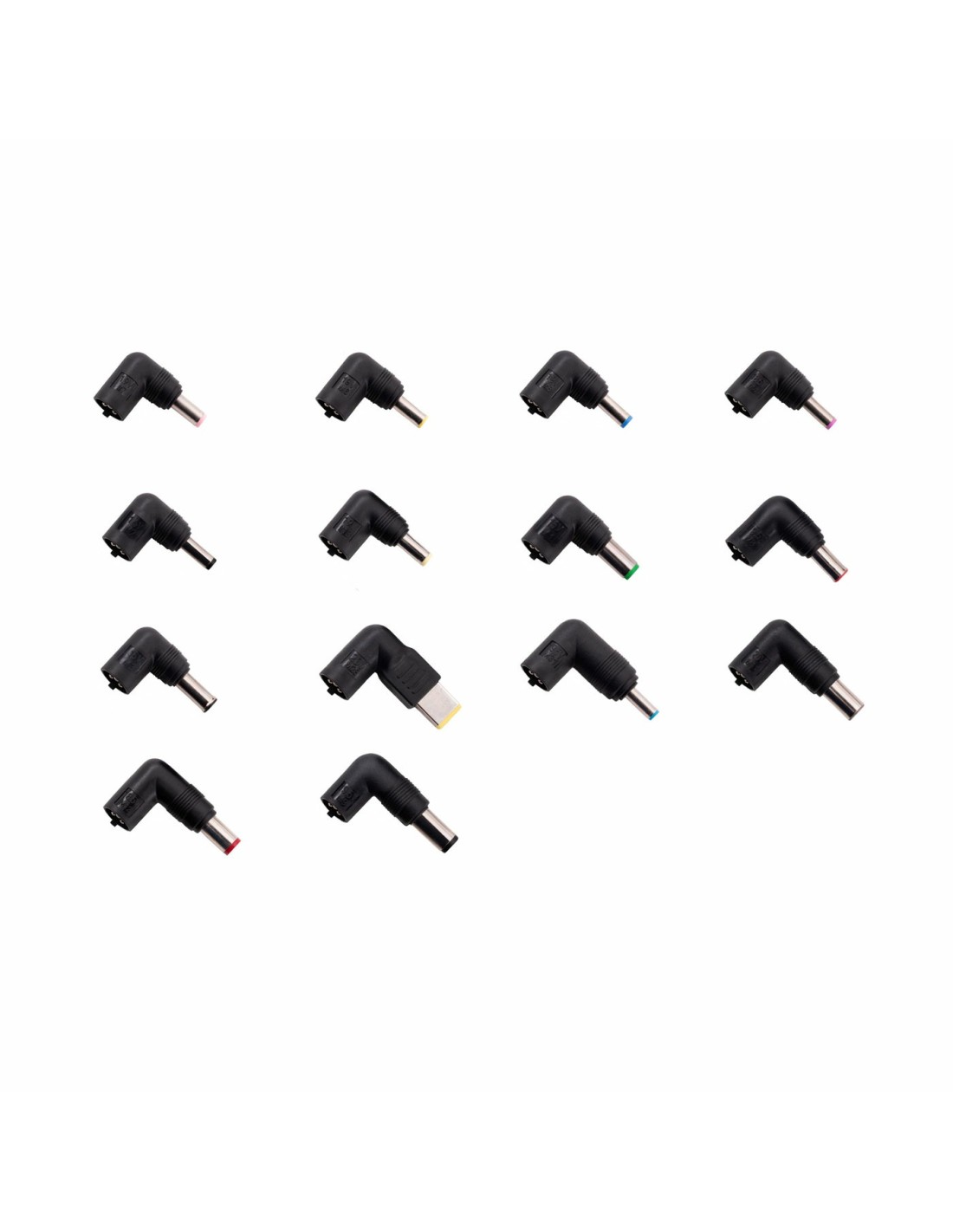 Cargador portátiles 90W con selección automática de voltaje de salida. Incluye 14 puntas de alta calidad y puerto USB de 2.1A para Smartphopnes y Tablets. Tacto suave de goma.