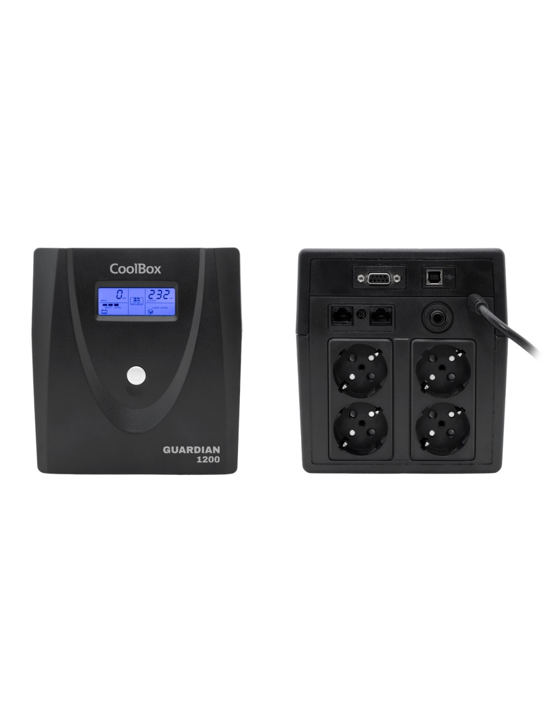 CoolBox SAI GUARDIAN3 LCD 1200VA 720w 4 SCHUKOS + SOFTWARE. Topología UPS: Línea interactiva, Capacidad de potencia de salida (VA): 1,2 kVA, Potencia de salida: 720 W. Tipo de salida AC: Tipo F, Cantidad de salidas AC: 4 salidas AC, Tipo de puerto USB: USB Tipo B. Capacidad de la batería: 7 Ah, Voltaje de la pila: 12 V, Tiempo de recarga (90%): 8 h. Factor de forma: Compacto, Color del producto: Negro, Tipo de visualizador: LCD. Cables incluidos: Cable USB