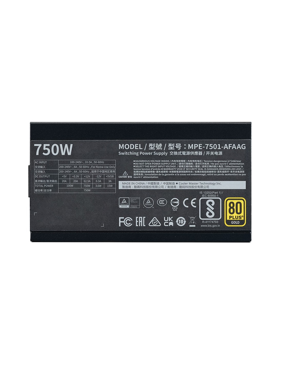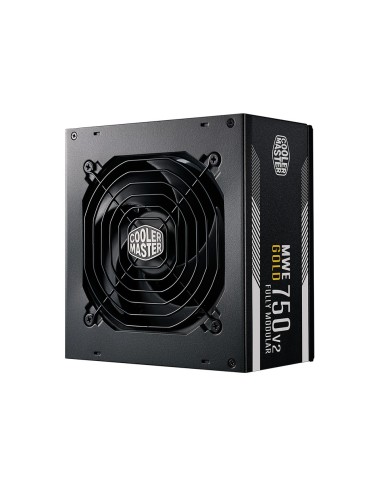 Cooler Master MWE Gold 750 V2 ATX 3.1. Potencia total: 750 W, Voltaje de entrada AC: 100 - 240 V, Frecuencia de entrada AC: 50/60 Hz. Alimentador de energía para tarjeta madre: 24-pin ATX, Longitud del cable de alimentación de la placa base: 61 cm, Longitud del cable de alimentación SATA: 500,620,740,860 mm. Utilizar con: PC, Factor de forma de fuente de alimentación (PSU): ATX, Certificación 80 PLUS: 80 PLUS Gold. Color del producto: Negro, Tipo de enfriamiento: Activo, Diámetro de ventilador: 12 cm. Certificación: TUV, CE, CCC, EAC, RCM, cTUVus, FCC, BSMI, BIS, UKCA