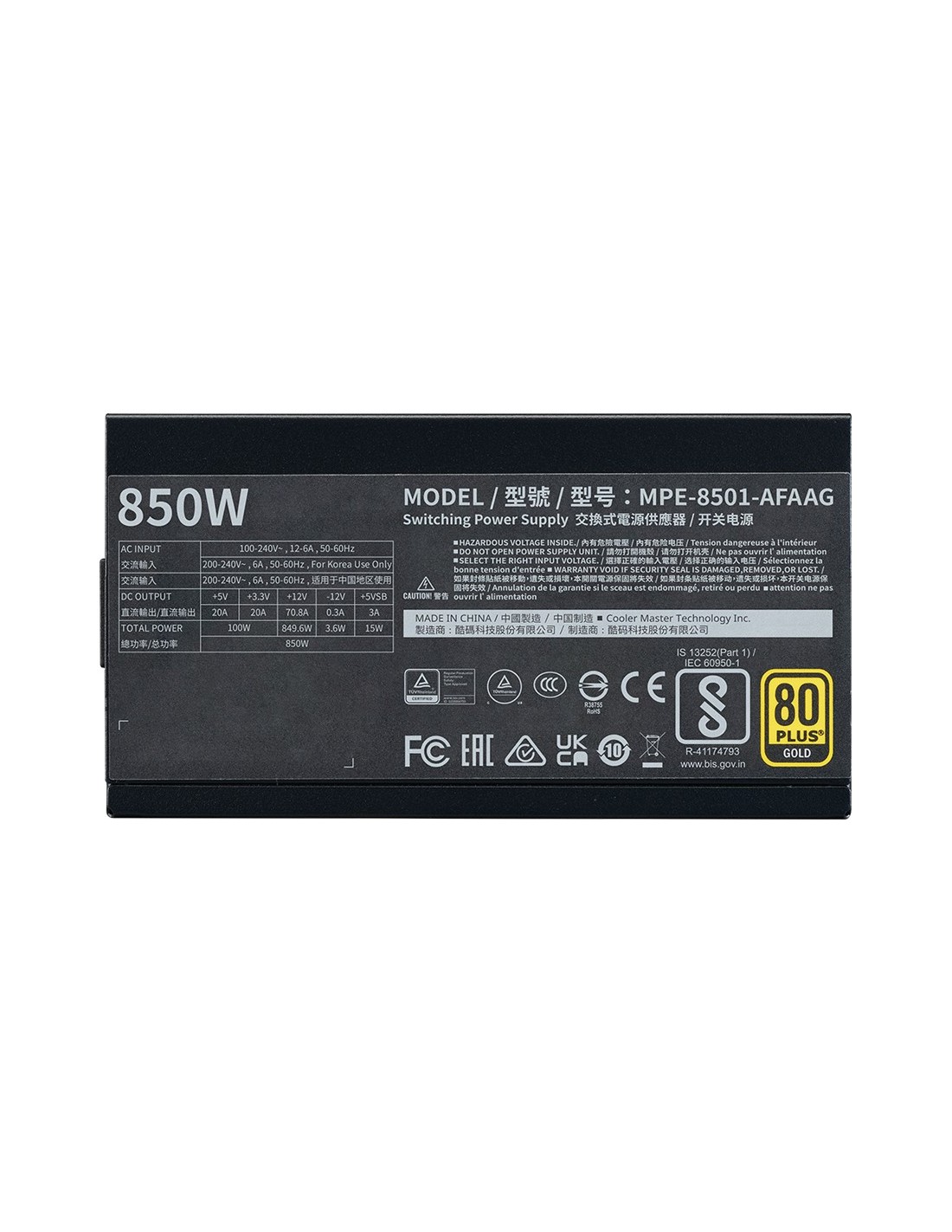 Cooler Master MWE Gold 850 V2 ATX 3.1. Potencia total: 850 W, Voltaje de entrada AC: 100 - 240 V, Frecuencia de entrada AC: 50/60 Hz. Alimentador de energía para tarjeta madre: 24-pin ATX, Longitud del cable de alimentación de la placa base: 61 cm, Longitud del cable de alimentación SATA: 500,620,740,860 mm. Utilizar con: PC, Factor de forma de fuente de alimentación (PSU): ATX, Certificación 80 PLUS: 80 PLUS Gold. Color del producto: Negro, Tipo de enfriamiento: Activo, Diámetro de ventilador: 12 cm. Certificación: TUV, CE, CCC, EAC, RCM, cTUVus, FCC, BSMI, BIS, UKCA