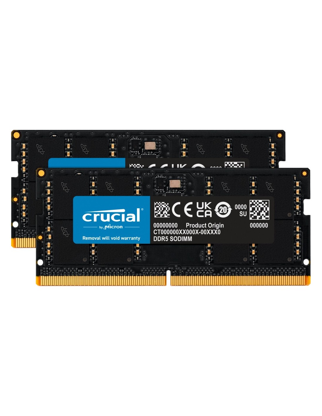 Crucial CT2K32G48C40S5. Componente para: Portátil, Memoria interna: 64 GB, Diseño de memoria (módulos x tamaño): 2 x 32 GB, Tipo de memoria interna: DDR5, Velocidad de memoria del reloj: 4800 MHz, Forma de factor de memoria: 262-pin SO-DIMM, Latencia CAS: 40