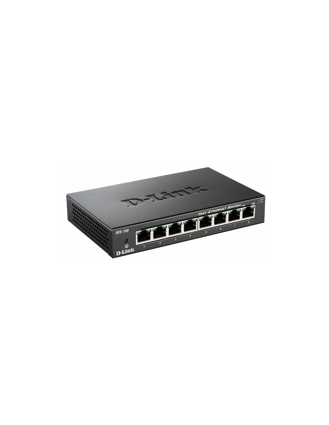 D-Link DES-108. Cantidad de puertos básicos de conmutación RJ-45 Ethernet: 8. Bidireccional completo (Full duplex). Tabla de direcciones MAC: 1000 entradas, Capacidad de conmutación: 1,6 Gbit/s. Estándares de red: IEEE 802.1p, IEEE 802.3, IEEE 802.3az, IEEE 802.3u, IEEE 802.3x. Conector eléctrico: Toma de entrada de CC