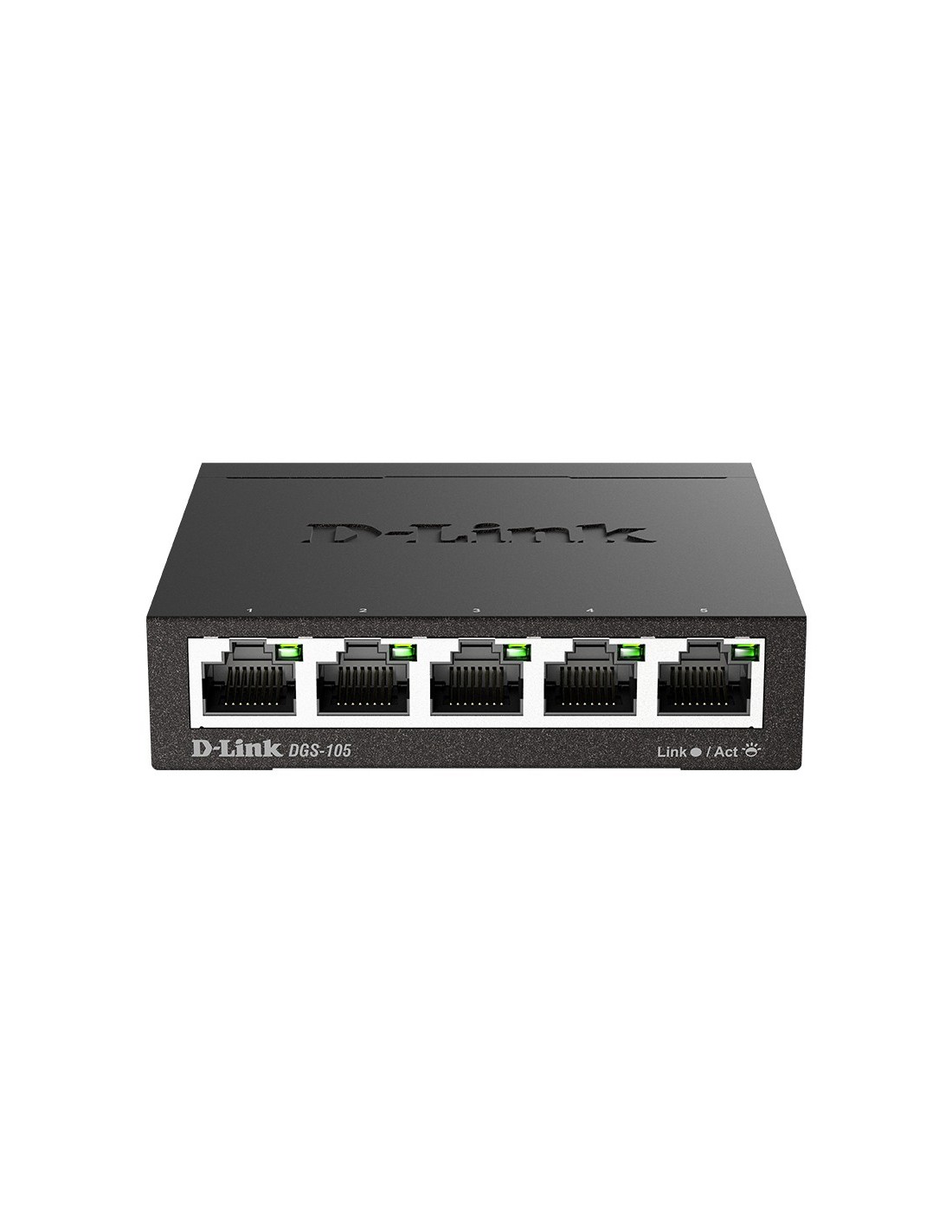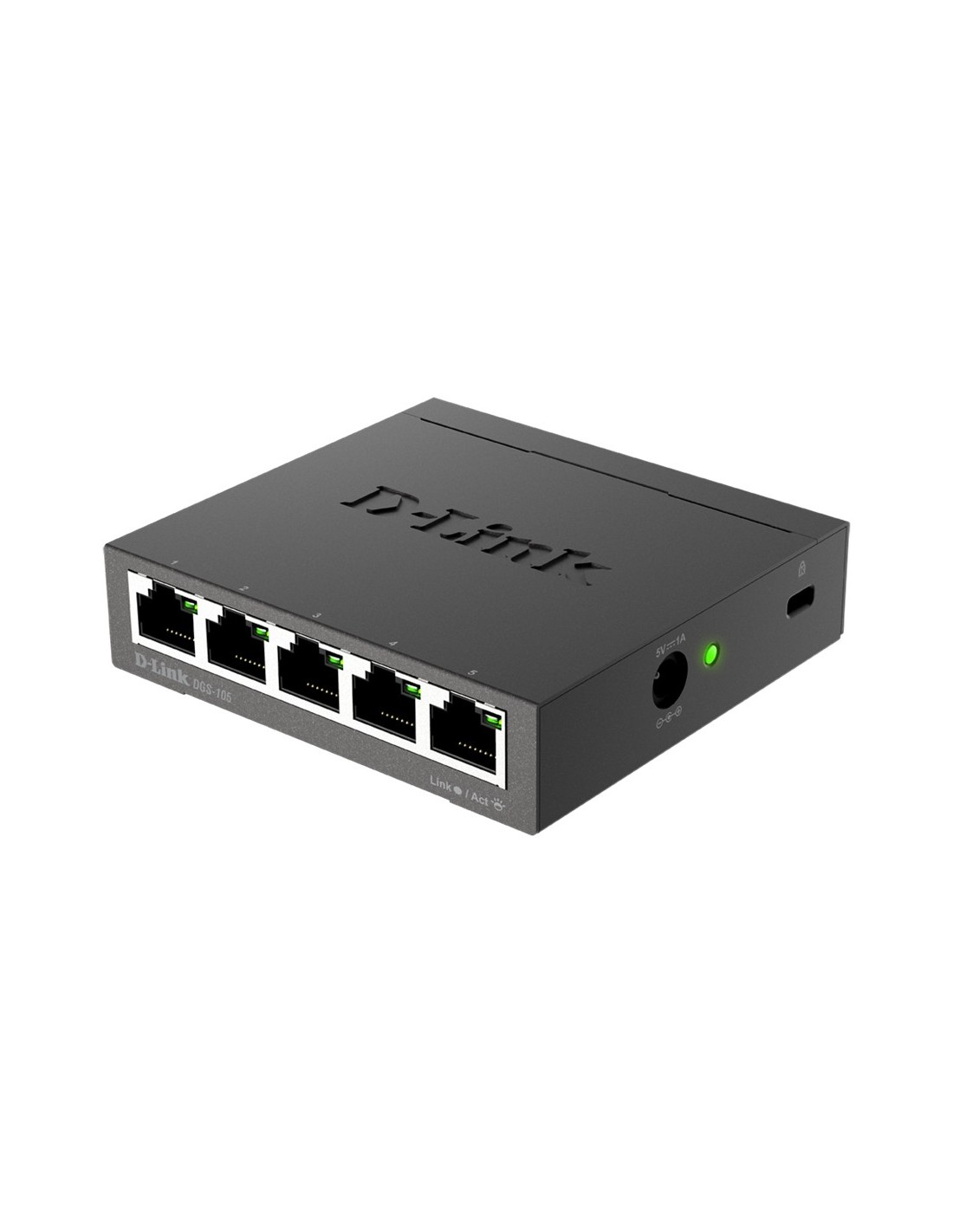 D-Link DGS-105. Tipo de interruptor: No administrado, Capa del interruptor: L2. Puertos tipo básico de conmutación RJ-45 Ethernet: Gigabit Ethernet (10/100/1000), Cantidad de puertos básicos de conmutación RJ-45 Ethernet: 5. Bidireccional completo (Full duplex). Tabla de direcciones MAC: 2000 entradas, Capacidad de conmutación: 10 Gbit/s. Estándares de red: IEEE 802.1p, IEEE 802.3, IEEE 802.3ab, IEEE 802.3az, IEEE 802.3u, IEEE 802.3x. Conector eléctrico: Toma de entrada de CC