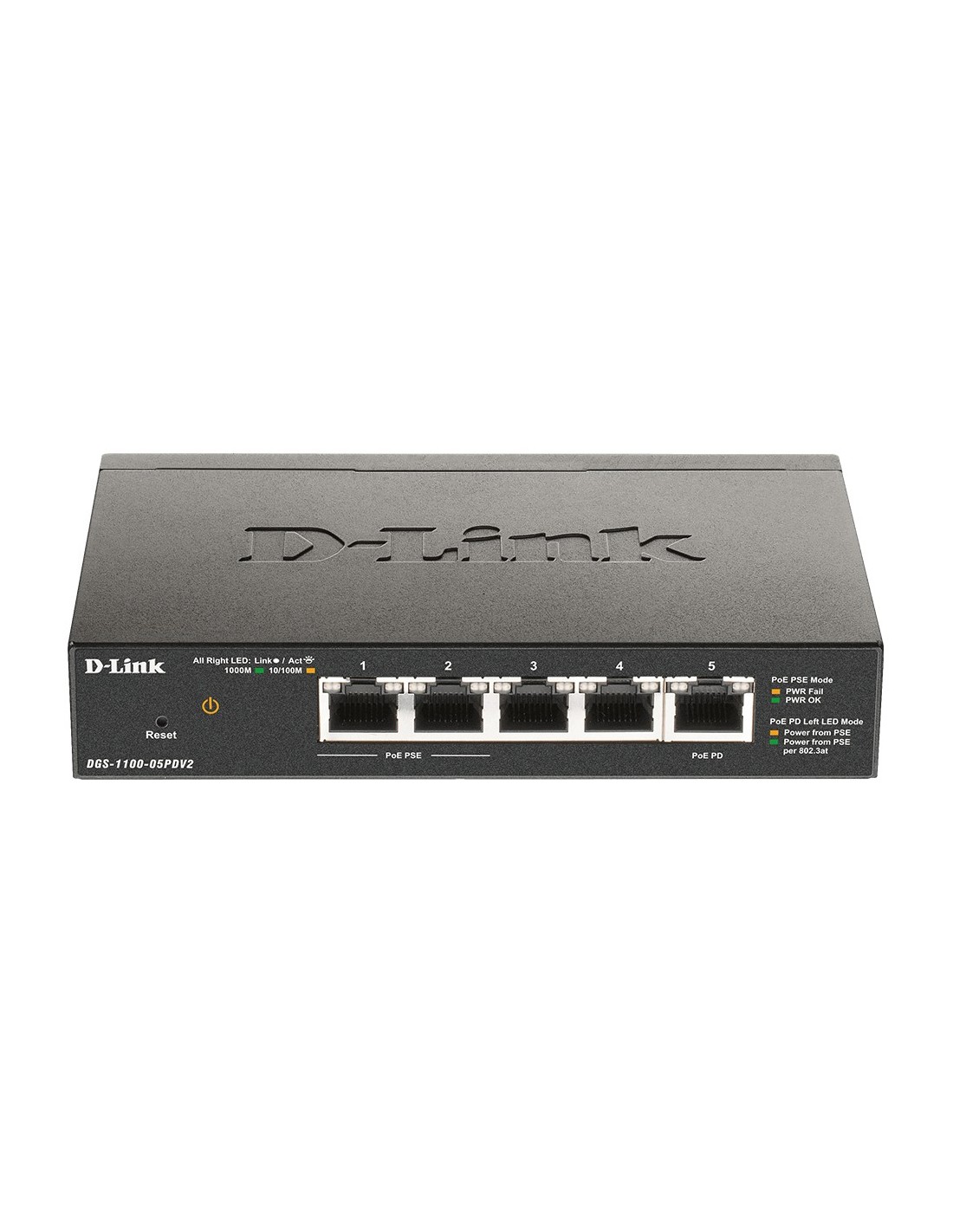 D-Link DGS-1100-05PDV2. Tipo de interruptor: Gestionado. Puertos tipo básico de conmutación RJ-45 Ethernet: Gigabit Ethernet (10/100/1000), Cantidad de puertos básicos de conmutación RJ-45 Ethernet: 5. Bidireccional completo (Full duplex). Tabla de direcciones MAC: 2000 entradas, Capacidad de conmutación: 10 Gbit/s. Estándares de red: IEEE 802.3, IEEE 802.3ab, IEEE 802.3af, IEEE 802.3at, IEEE 802.3az, IEEE 802.3u, IEEE 802.3x. Energía sobre Ethernet (PoE)