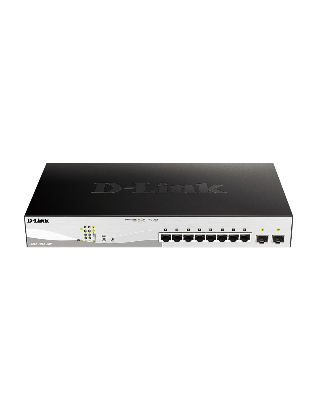 D-Link DGS-1210-10MP. Tipo de interruptor: Gestionado, Capa del interruptor: L2. Puertos tipo básico de conmutación RJ-45 Ethernet: Gigabit Ethernet (10/100/1000), Cantidad de puertos básicos de conmutación RJ-45 Ethernet: 8, Número de módulos SFP instalados: 2. Bidireccional completo (Full duplex). Tabla de direcciones MAC: 8000 entradas, Capacidad de conmutación: 20 Gbit/s. Estándares de red: IEEE 802.3, IEEE 802.3ab, IEEE 802.3af, IEEE 802.3at, IEEE 802.3az, IEEE 802.3u, IEEE 802.3x, IEEE.... Energía sobre Ethernet (PoE)