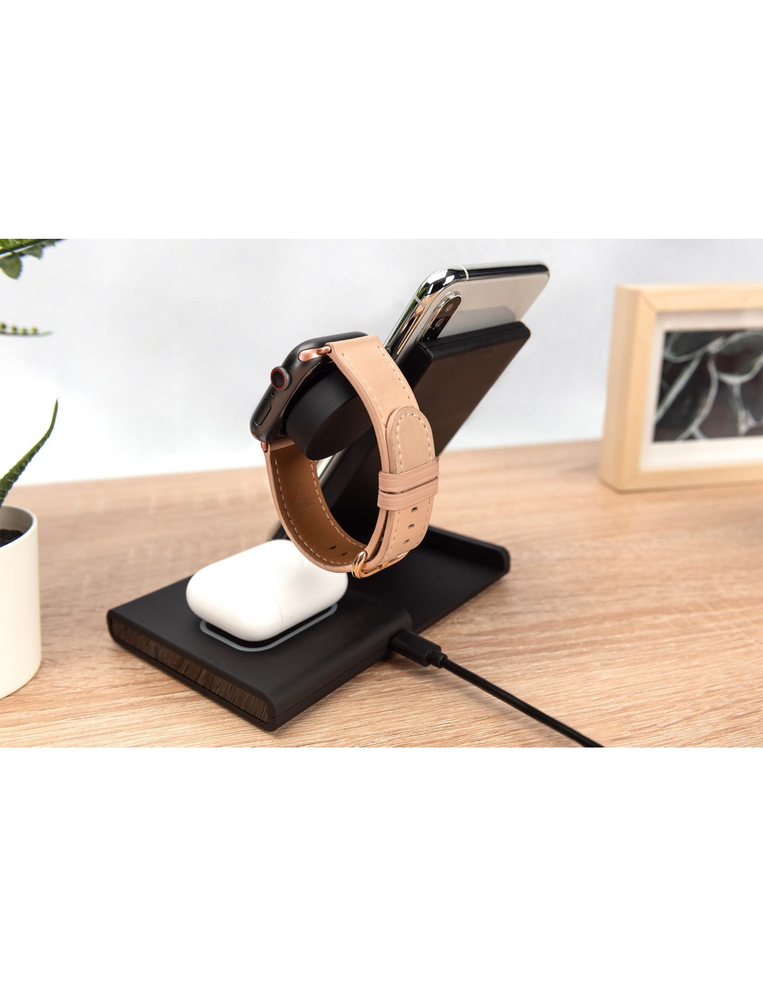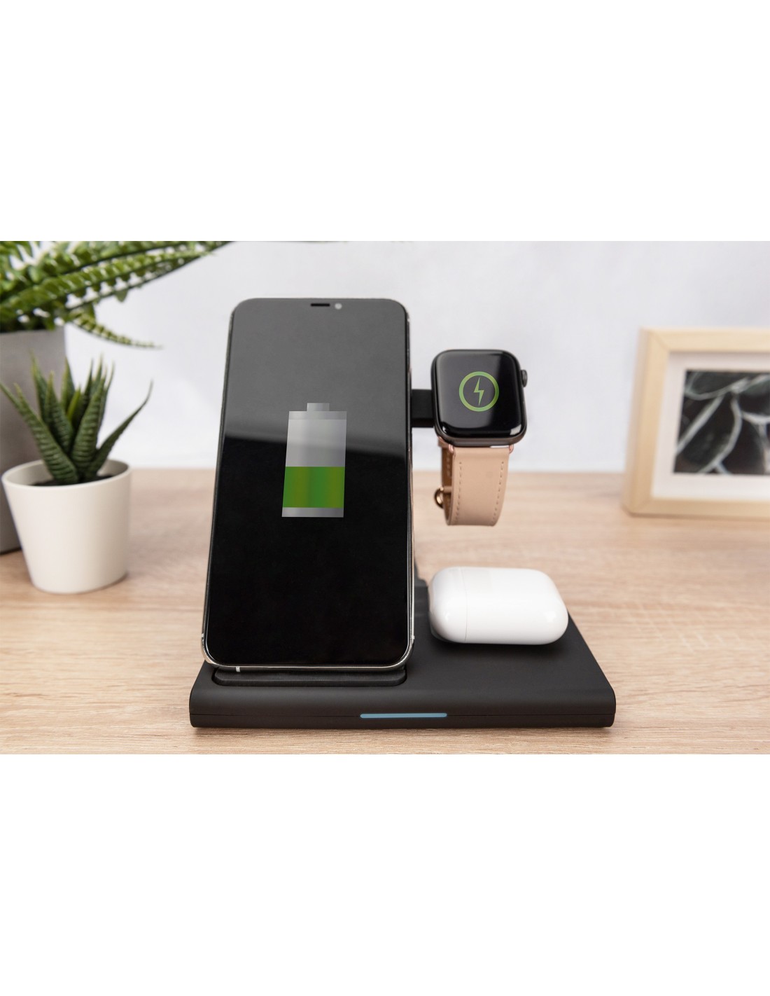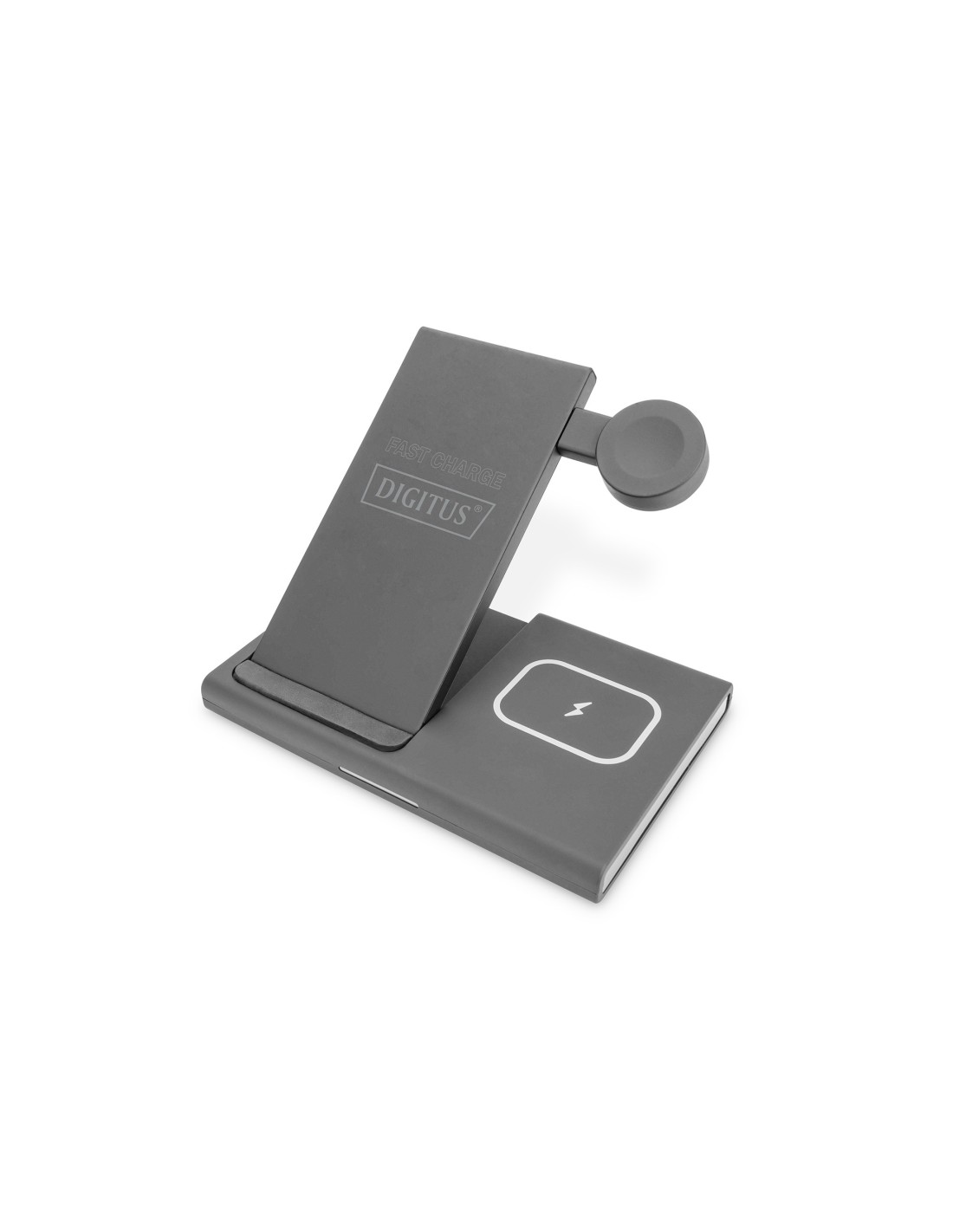 La estación de carga inalámbrica 3 en 1 de DIGITUS® permite la carga simultánea de un iPhone® u otro smartphone apto para QI, un iWatch®, así como AirPods® que admiten la carga inductiva. La carga tiene lugar de forma inalámbrica mediante inducción. Basta con colocar los dispositivos; la carga se inicia automáticamente. El ángulo de inclinación de la base de carga para el smartphone se puede regular de forma continua. El iWatch® se sujeta en su lugar por medio de imanes y no se necesita la almohadilla de carga original. La superficie de la estación es antideslizante para asegurar que los dispositivos permanezcan en su lugar.