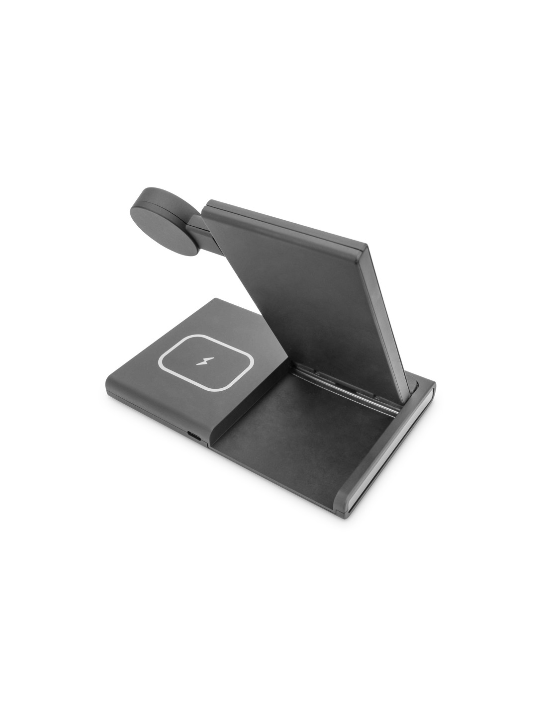 Digitus Estación de carga 3 en 1, plegable, inalámbrica. Tipo: Independiente, Color del producto: Negro, Principio de funcionamiento: Sin contacto. Potencia máxima: 15 W, Voltaje de salida máximo: 12 V, Corriente de salida (máx.): 2 A. Ancho: 145 mm, Profundidad: 155 mm, Altura: 15 mm. Ancho del paquete: 170 mm, Profundidad del paquete: 505 mm, Altura del paquete: 2,1 mm. Cables incluidos: USB, Cantidad por paquete: 1 pieza(s)