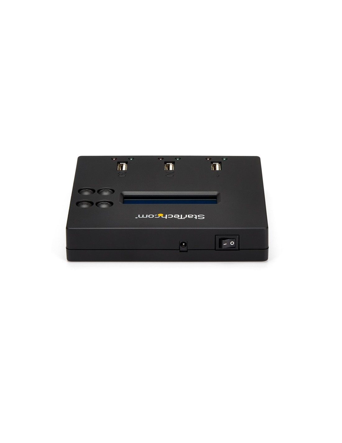 El clonador USB le permite copiar hasta dos unidades simultáneamente (duplicación sincrónica) con velocidades de hasta 1,5 GB por minuto. También ofrece una duplicación asíncrona que le permite extraer y sustituir una unidad mientras la otra sigue copiando.