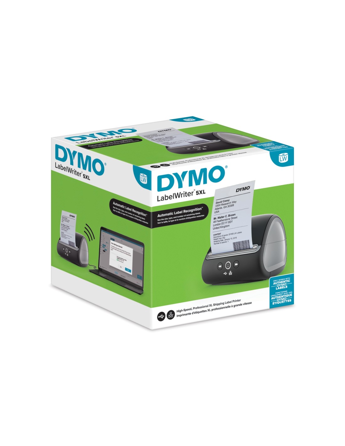 La DYMO® LabelWriter™ 5XL imprime etiquetas de gran formato (extra-grandes) con facilidad, lo que la convierte en la opción perfecta para las etiquetas de seguridad profesional, almacenamiento, códigos de barras, seguimiento de bienes, señalización y otras necesidades. La tecnología térmica directa evita tener que usar tinta o tóner caras y la aplicación inteligente DYMO Connect para software de ordenadores se conecta al PC o Mac lo que permite un gran número de posibilidades de diseño con mucho estilo. La DYMO® LabelWriter™ 5XL permite la impresión de etiquetas grandes (de gran formato) como estándar, lo que la convierte en una gran elección para las necesidades de etiquetado profesionales, desde la seguridad y almacenamiento hasta los códigos de barras, seguimiento de bienes, señalización y mucho más. La tecnología térmica directa evita tener que usar tinta o tóner caras y la aplicación inteligente DYMO Connect para software de escritorio se conecta el PC o Mac lo que permite un gran número de posibilidades de diseño con mucho estilo. La nueva tecnología única de reconocimiento de etiquetas significa que ya no tendrá que intentar adivinar más que tipo de etiqueta es la adecuada de una lista desplegable. Siempre sabrá que tamaño, tipo y color de etiqueta se ha cargado y ya nunca se quedará de nuevo a medias de la impresión. La tecnología de impresión térmica directa evita tener que comprar tinta o tóner caros, imprime a alta velocidad con un resultado de hasta 53 etiquetas por minuto y genera cantidades precisas de etiquetas sin necesidad de pelearse con hojas de etiquetas.