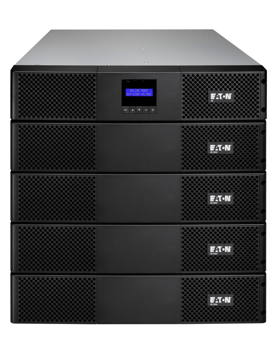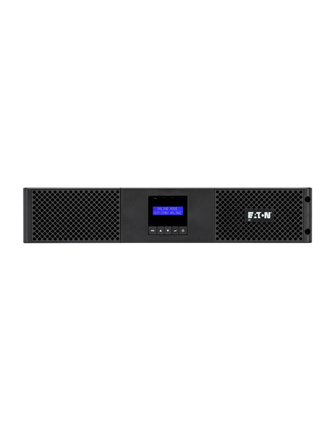Eaton 9E2000IR. Topología UPS: Doble conversión (en línea), Capacidad de potencia de salida (VA): 2 kVA, Potencia de salida: 1800 W. Tipo de salida AC: C13 acoplador, C14 acoplador, Conector: C13 acoplador, Cantidad de salidas AC: 6 salidas AC. Tecnología de batería: Plomo-ácido, Capacidad de la batería: 7 Ah, Voltaje de la pila: 12 V. Factor de forma: Torre, Color del producto: Negro, Capacidad del rack: 2U. Certificados de conformidad: CE, Certificación: IEC/EN 62040-1 IEC/EN 62040-2 CE