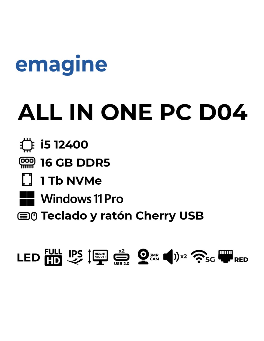 Emagine All in One D04 de 23,8” con Intel i5, 16GB DDR5, 1TB NVMe y Windows 11. Incluye cámara, altavoces, teclado y ratón. Configurable con Windows Pro/Home, teclado cableado o inalámbrico, diferentes planes de garantía y Office 2024.