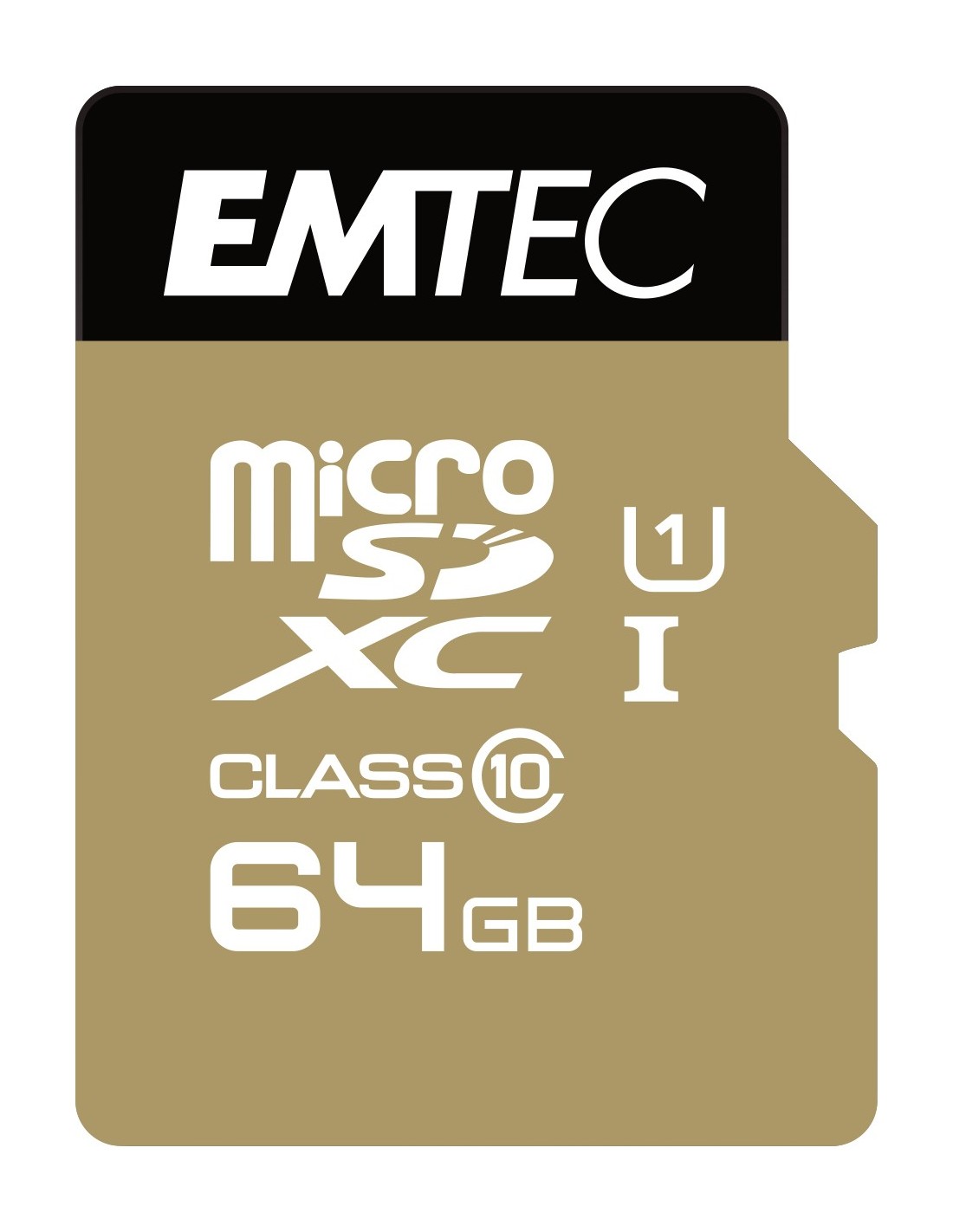 Emtec microSD Class10 Gold+ 64GB. Capacidad: 64 GB, Tipo de tarjeta flash: MicroSDXC, Clase de memoria flash: Clase 10, Velocidad de lectura: 85 MB/s, Velocidad de escritura: 21 MB/s. Color del producto: Negro, Oro