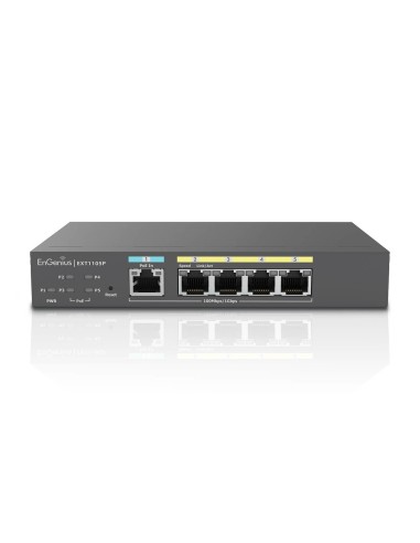 EnGenius EXT1105P. Tipo de interruptor: Gestionado, Capa del interruptor: L2. Puertos tipo básico de conmutación RJ-45 Ethernet: Gigabit Ethernet (10/100/1000), Cantidad de puertos básicos de conmutación RJ-45 Ethernet: 5. Tabla de direcciones MAC: 8000 entradas, Capacidad de conmutación: 10 Gbit/s. Estándares de red: IEEE 802.1p, IEEE 802.1w, IEEE 802.3ab, IEEE 802.3u. Energía sobre Ethernet (PoE)
