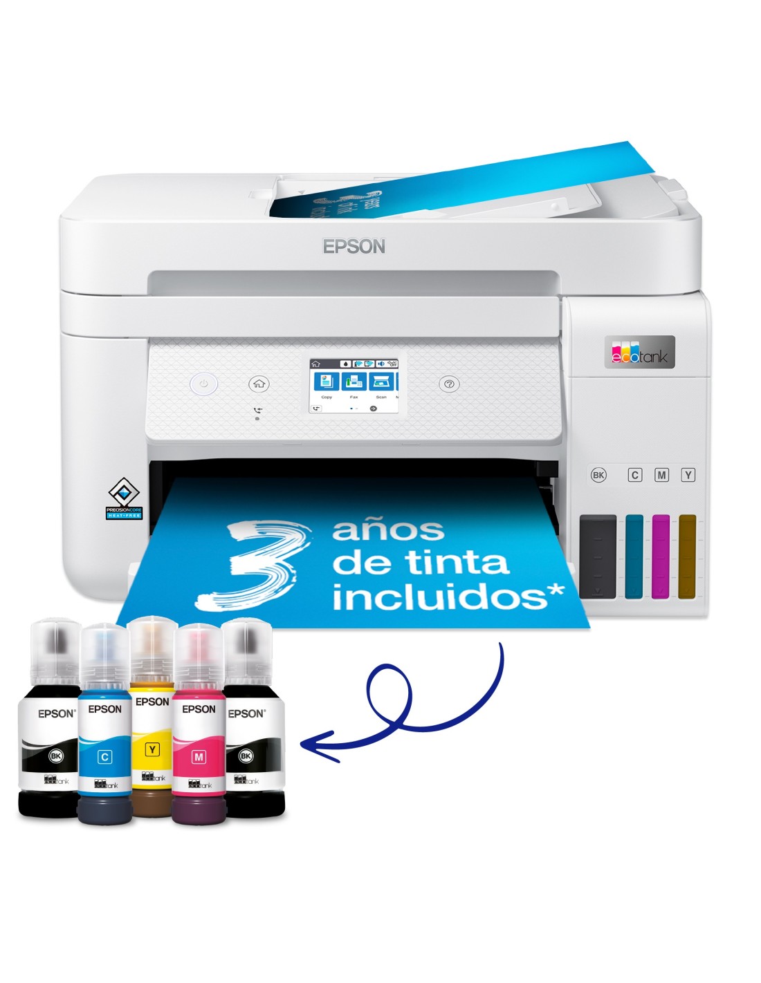 Ahorra hasta un 90 % en costes de impresión* con esta impresora, que incluye de entrada una botella de tinta negra adicional para imprimir hasta 3 años sin necesidad de reposición*. Un solo juego de botellas de tinta permite imprimir hasta 14000 páginas en negro y 5200 en color*, lo que equivale a unos 72 cartuchos de tinta.*