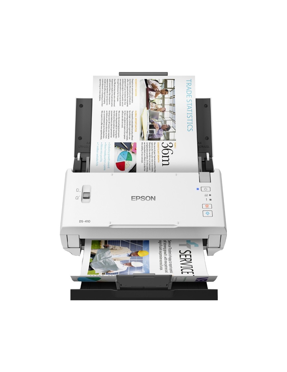 Epson WorkForce DS-410. Tamaño máximo de escaneado: 215,9 x 3048 mm, Resolución óptica de escáner: 600 x 600 DPI, Profundidad de entrada de color: 48 bit. Tipo de escaneado: Escáner alimentado con hojas, Color del producto: Negro, Blanco. Tipo de sensor: CIS, Ciclo de trabajo diario (max): 3000 páginas, Formatos de archivo para escaneo: BMP, JPG, PDF, PNG, TIFF. Capacidad de entrada estándar: 50 hojas, Capacidad del alimentador automático de documentos: 50 hojas. Tamaño máximo de papel ISO A-series: A4, Tipos de media soportados de escaneo: Tarjeta de visita, Post Card(JPN), ISO tamaño de serie A (A0...A9): A4, A5, A6