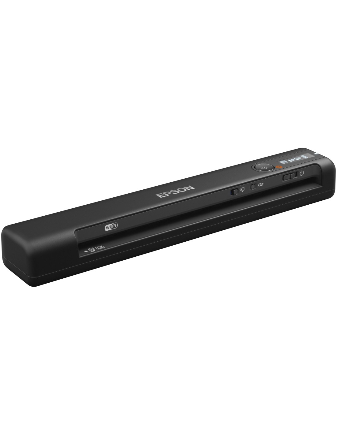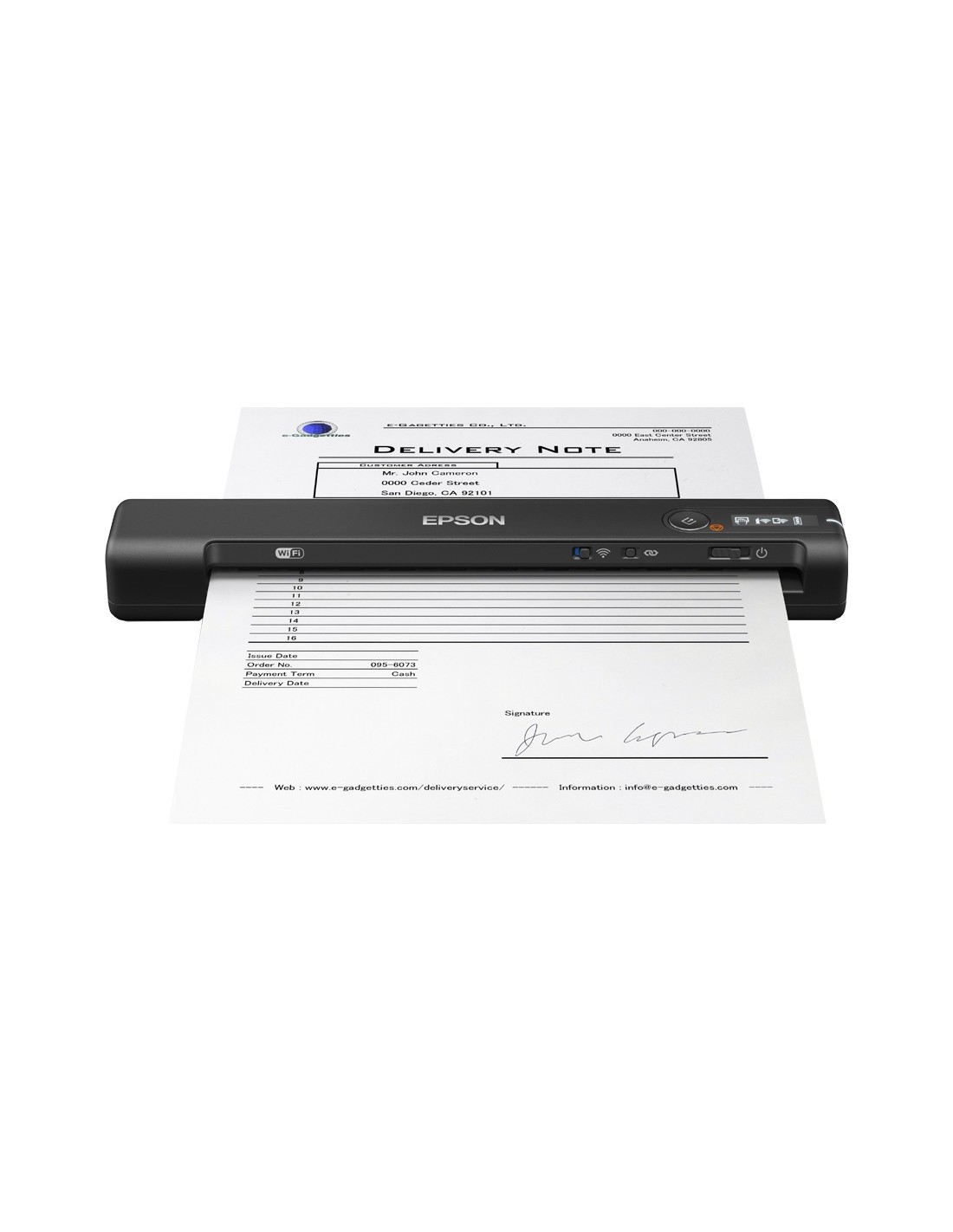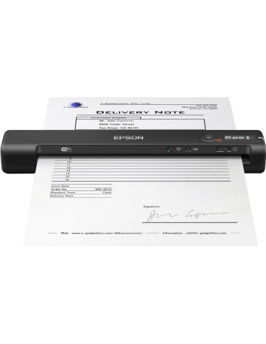 Epson WorkForce ES-60W. Resolución óptica de escáner: 600 x 600 DPI, Profundidad de entrada de color: 48 bit, Profundidad de salida de color: 24 bit. Tipo de escaneado: Escáner portátil, Color del producto: Negro. Tipo de sensor: CIS, Ciclo de trabajo diario (max): 300 páginas, Fuentes de luz: ReadyScan LED. Capacidad del alimentador automático de documentos: 1 hojas. Tamaño máximo de papel ISO A-series: A4, Tipos de media soportados de escaneo: Tarjeta de visita, Tarjeta de plástico, ISO tamaño de serie A (A0...A9): A3, A4, A5, A6, A7, A8