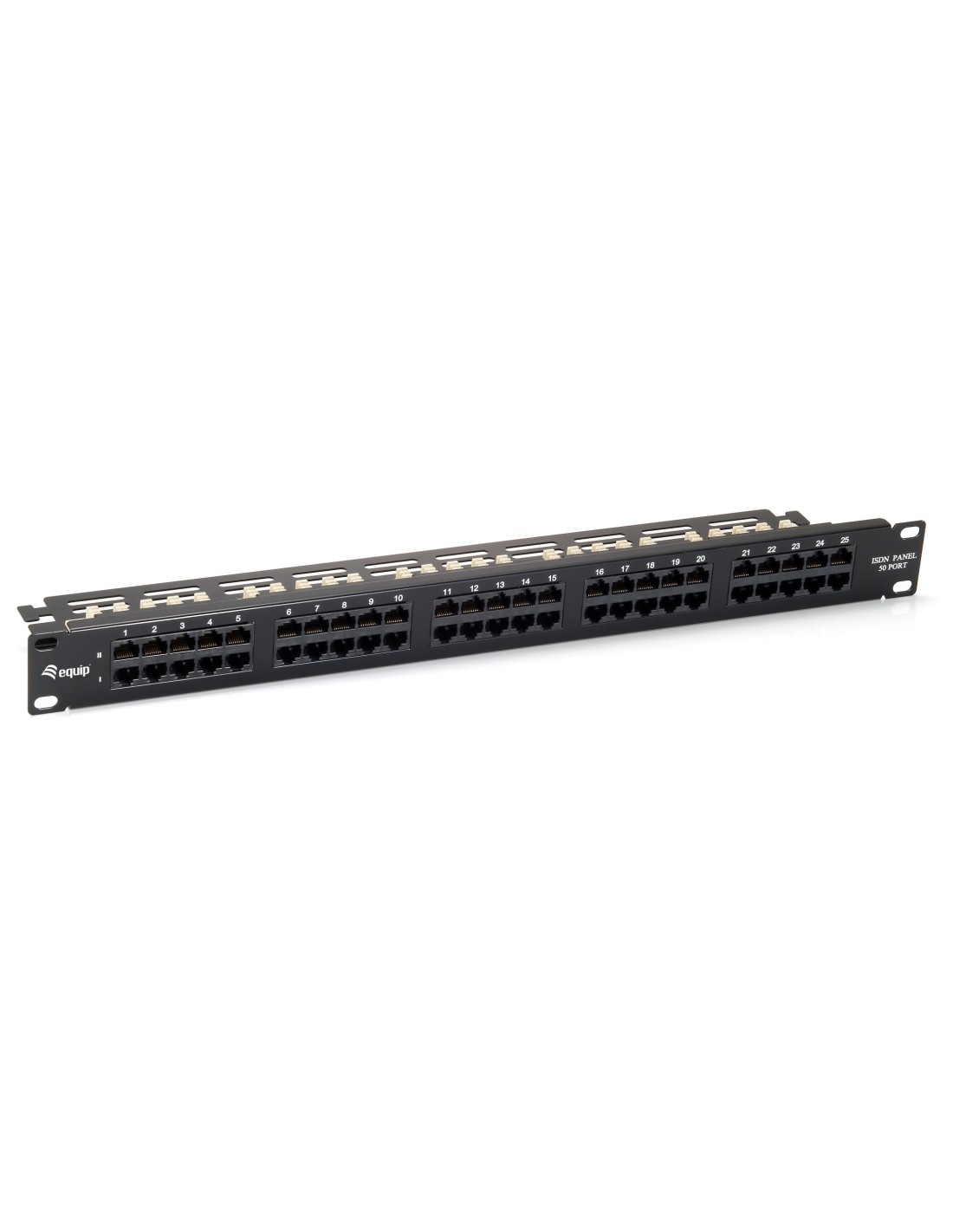 Equip 125295. Tipos de cable soportados: Cat3. Color del producto: Negro, Montaje: Montaje en bastidor, Capacidad del rack: 1U. Ancho: 44 mm, Altura: 483 mm, Profundidad: 100 mm. Ancho del paquete: 125 mm, Profundidad del paquete: 55 mm, Altura del paquete: 500 mm
