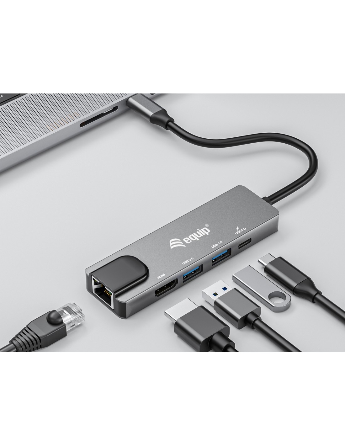 Equip Adaptador multifunción USB-C 5 en 1, HDMI , Gigabit LAN, USB 3.2 GEN1, 100W USB PD. Tecnología de conectividad: Alámbrico, Interfaz de host: USB 3.2 Gen 1 (3.1 Gen 1) Type-C, Entrega de energía USB (USB Power Delivery) de hasta: 100 W. Ethernet LAN, velocidad de transferencia de datos: 10,100,1000 Mbit/s. Color del producto: Gris, Velocidad de transferencia de datos: 5 Gbit/s, Tipo HD: 4K Ultra HD. Alimentación: USB, Longitud del cable USB: 0,25 m. Sistema operativo Windows soportado: Windows 10, Windows 10 Education, Windows 10 Education x64, Windows 10 Enterprise, Windows 10..., Sistema operativo MAC soportado: Mac OS X 10.10 Yosemite, Mac OS X 10.12 Sierra, Mac OS X 10.13 High Sierra, Mac OS X 10.14 Mojave,..., Sistemas operativos móviles soportados: Android 10.0, Android 11.0, Android 12.0, Android 13.0, Android 5.0, Android 5.1, Android 6.0,...