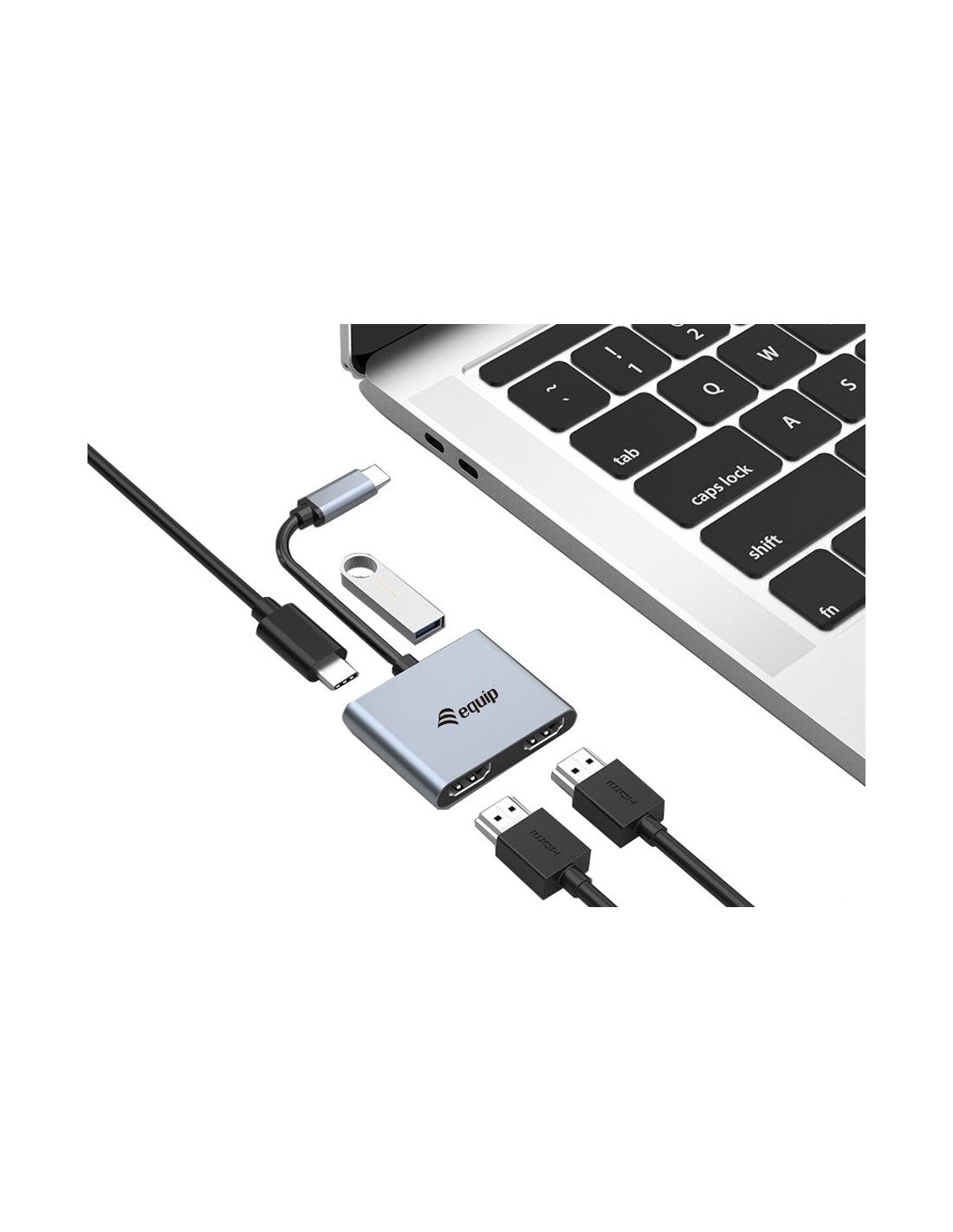 Equip Adaptador USB-C 4 en 1 Dual HDMI, USB 3.0, 100W USB PD. Interfaz de host: USB 3.2 Gen 1 (3.1 Gen 1) Type-C. Color del producto: Plata, Tipo HD: 4K Ultra HD, Máxima velocidad de actualización: 30 Hz. Ancho: 56 mm, Profundidad: 10 mm, Altura: 180 mm. Cantidad por paquete: 1 pieza(s)