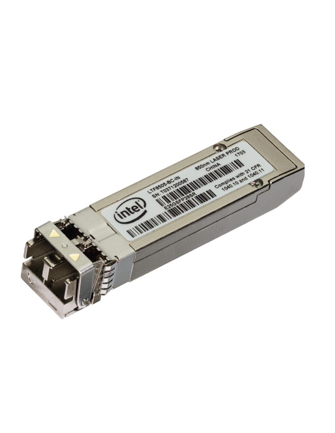 Intel E25GSFP28SR. Tipo de transceptor SFP: Fibra óptica, Rango máximo de transferencia de datos: 25000 Mbit/s, Tipo de interfaz: SFP28. Color del producto: Plata. Consumo energético: 1,2 W. Certificados de conformidad: RoHS. Cantidad por paquete: 1 pieza(s)