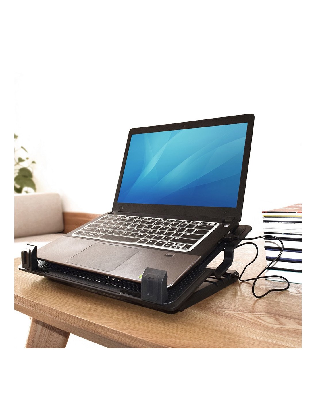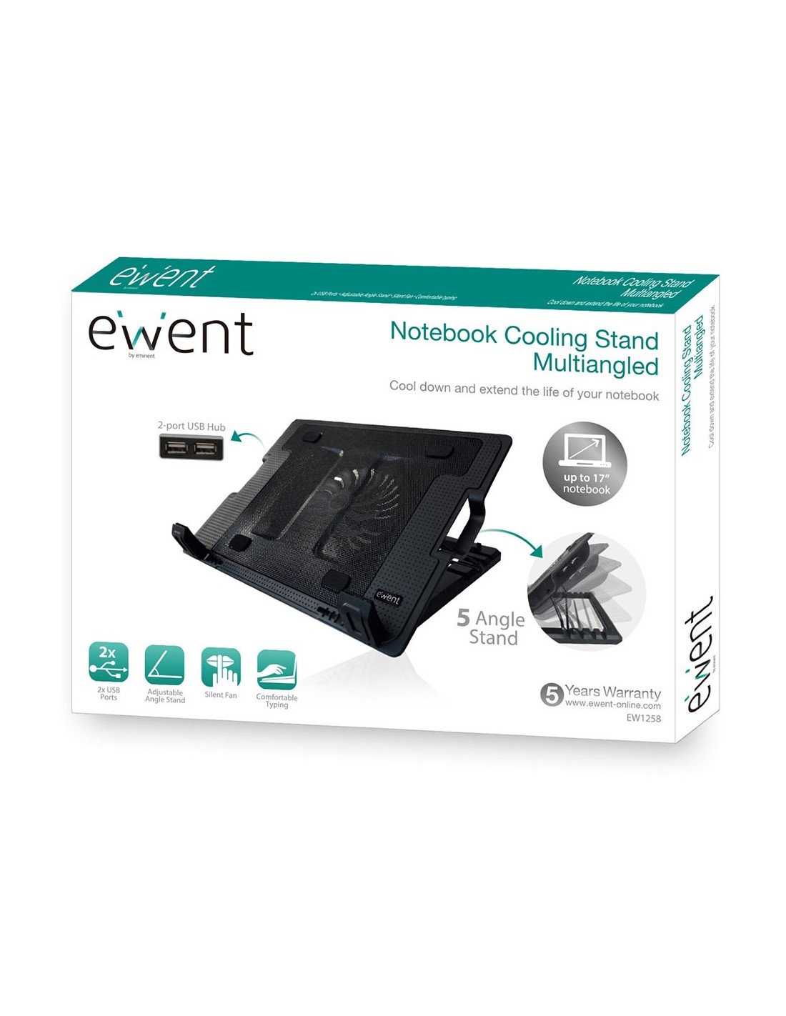 Ewent EW1258. Tamaño máximo de pantalla: 43,2 cm (17"), Número de ventiladores incluidos: 1 pieza(s), Tamaño mínimo de pantalla: 30,5 cm (12"). Color del producto: Negro, Material: ABS sintéticos, Aluminio. Interfaz de host: USB. Alimentación: USB, Voltaje de entrada: 5 V. Longitud de cable: 0,5 m, Peso: 1 kg