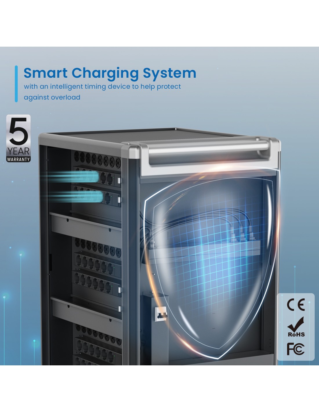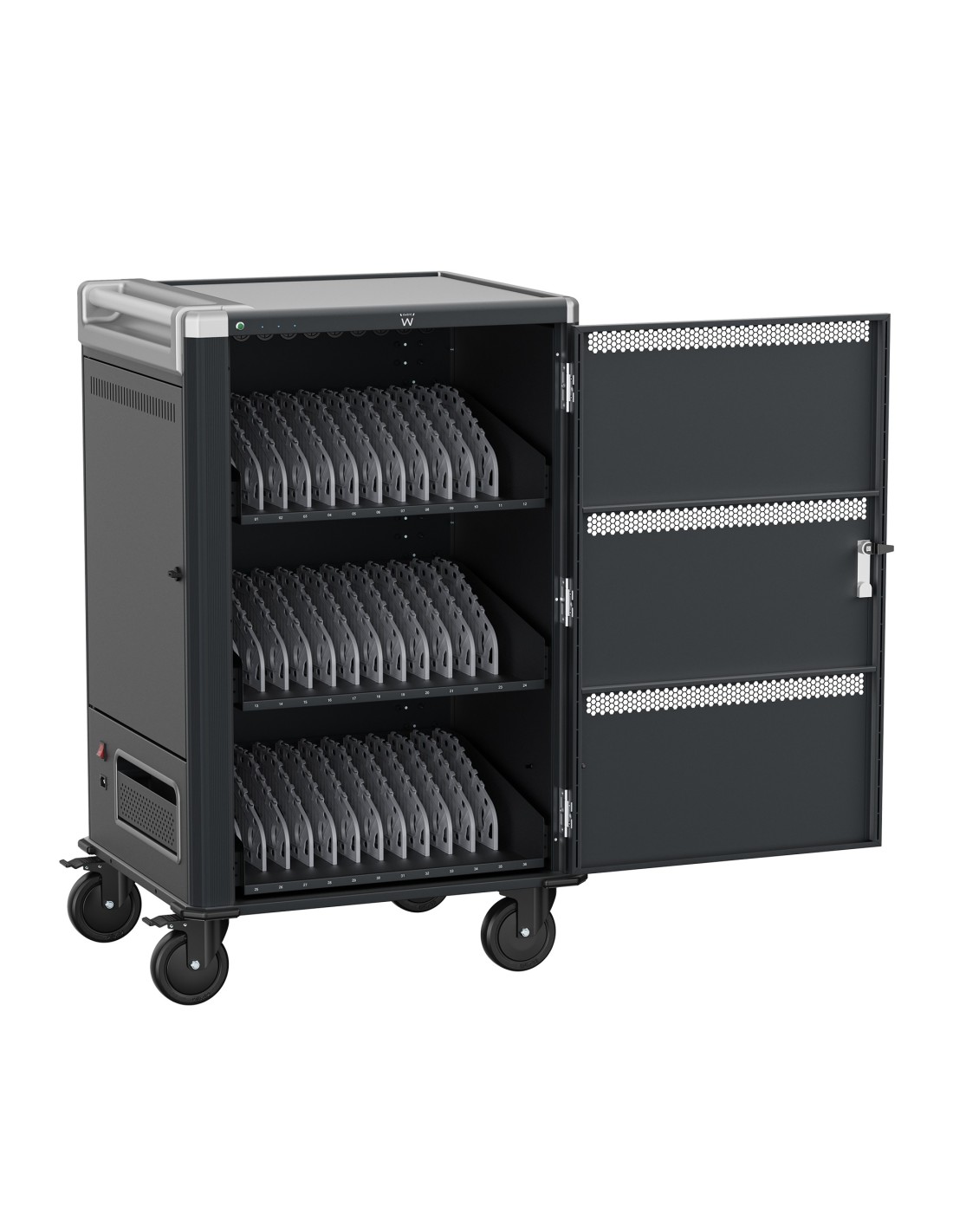 El carro de carga EW1701 le permite proteger, almacenar y cargar fácilmente hasta 36 dispositivos Tablets, Chromebook o portátiles con pantallas de hasta 15.6". Cuenta con un sistema de carga inteligente, estantes con ranuras para dispositivos flexibles y duraderas, un sistema de administración de cables/fuente de alimentación y, lo mejor de todo, está completamente ensamblado para una implementación rápida. Además, cuenta con espacios numerados para dispositivos y sus correspondientes espacios para suministro de energía para optimizar la organización. El carro también cuenta con puertas ventiladas con un mecanismo de bloqueo con llave de 3 puntos y la opción de agregar su propio candado para mayor seguridad.