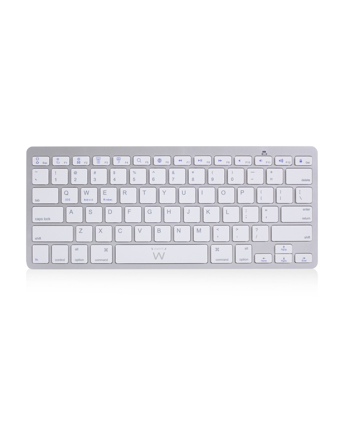 Ewent EW3161. Formato del teclado: Completo (100%). Estilo de teclado: Derecho. Tecnología de conectividad: Inalámbrico, Interfaz del dispositivo: Bluetooth, Interruptor del teclado: Interruptor mecánico, Diseño de teclado: QWERTY, Uso recomendado: Oficina. Color del producto: Plata, Blanco