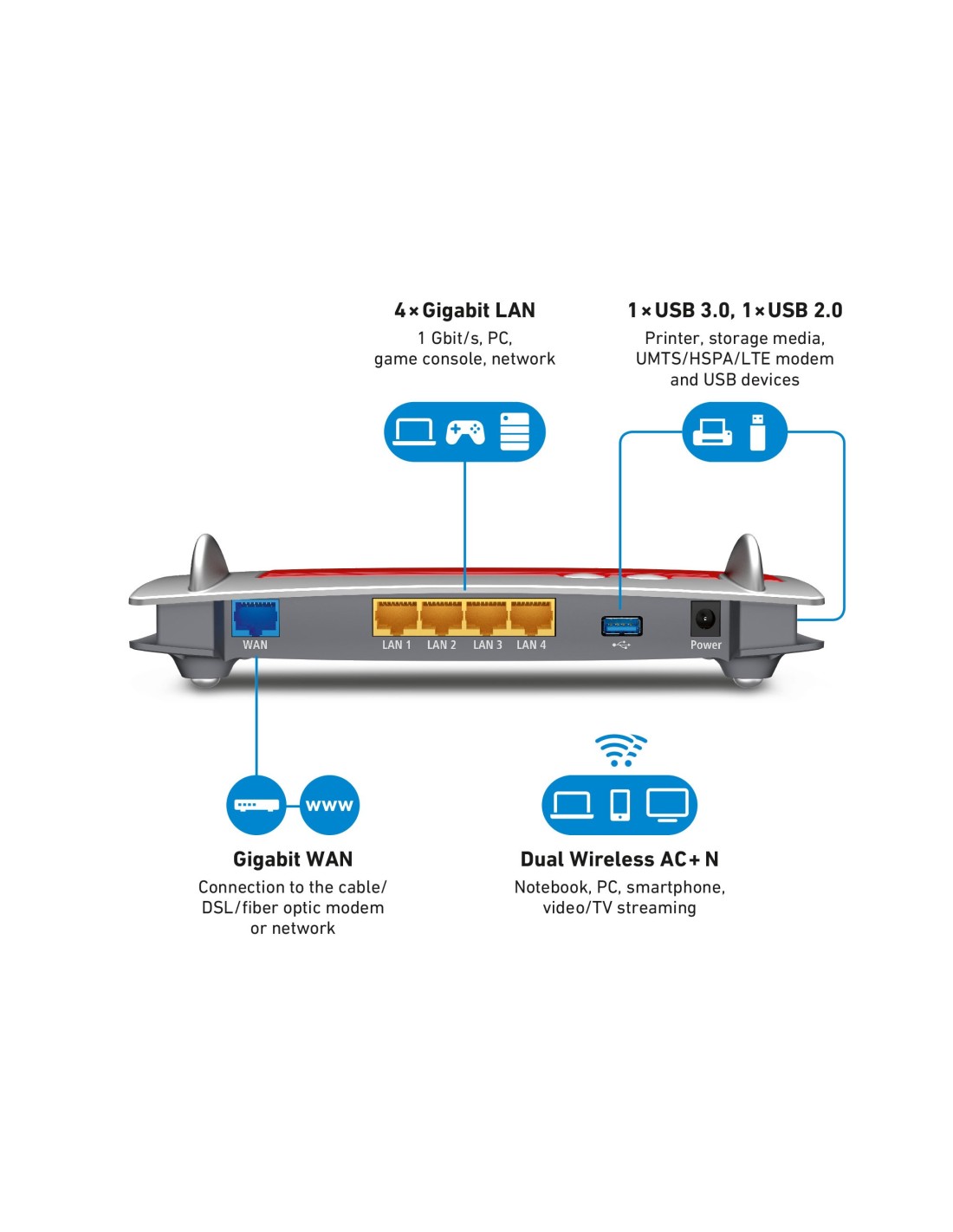 El 4040 combina el estándar WiFi AC de alta velocidad con el estándar WiFi N, para que las películas, la música y los datos se distribuyan de la mejor forma por todos los dispositivos de la red doméstica. Las videoconsolas y los dispositivos de red, como el televisor o la impresora, se pueden conectar a través de puertos LAN Gigabit de alta velocidad. Todo ello se completa con USB 3.0.