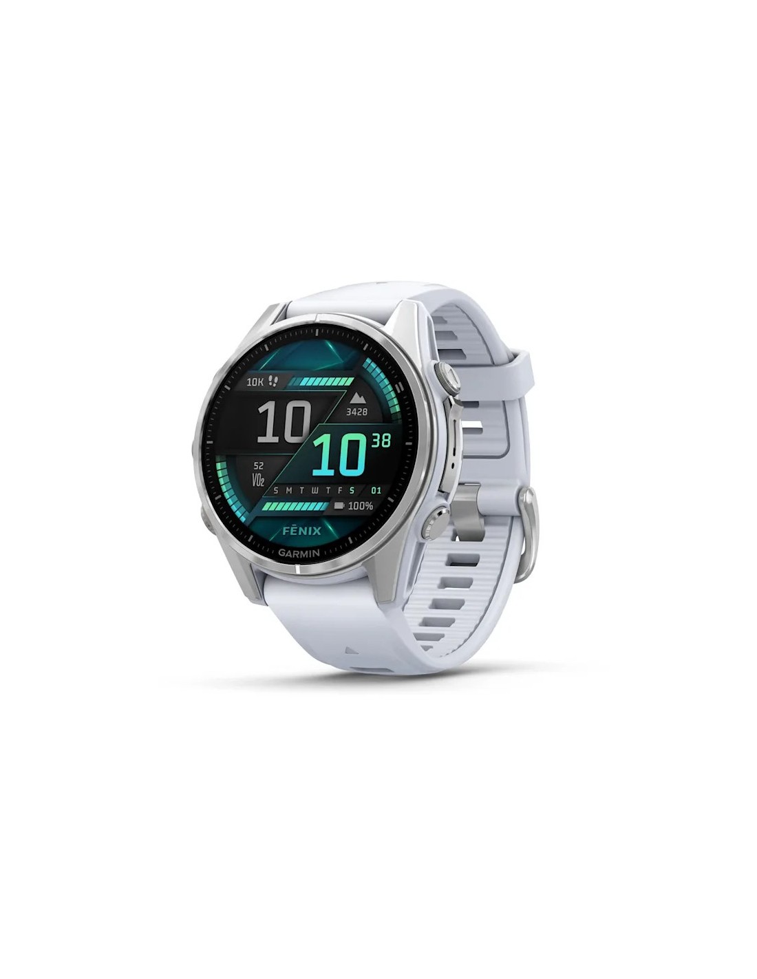 Garmin Fenix 8. Diagonal de la pantalla: 3,3 cm (1.3"), Tecnología de visualización: AMOLED, Resolución de la pantalla: 416 x 416 Pixeles, Pantalla táctil. Memoria flash: 32 GB. Wifi. GPS (satélite). Humedad: resistente al agua hasta: 40 m, Material de la banda: Silicona, Color de banda: Blanco, Tamaño de banda: Talla única