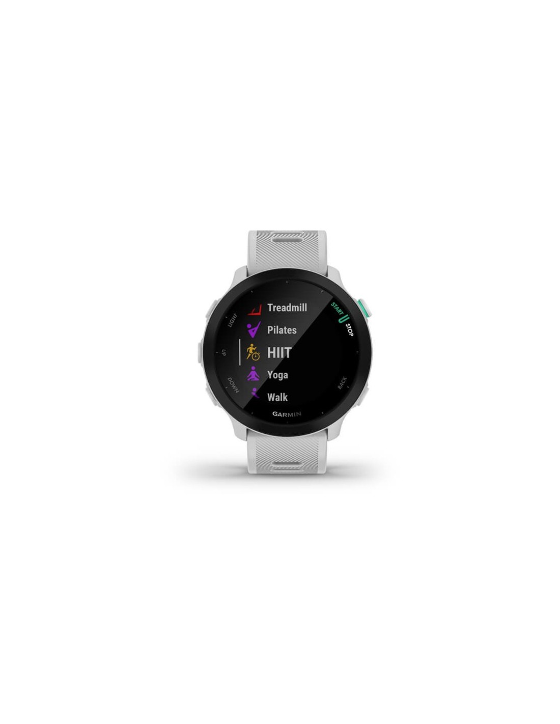 Garmin Forerunner 55. Diagonal de la pantalla: 2,64 cm (1.04"), Tecnología de visualización: MIP, Resolución de la pantalla: 208 x 208 Pixeles. GPS (satélite). Peso: 37 g. Material de la banda: Silicona, Color de banda: Blanco