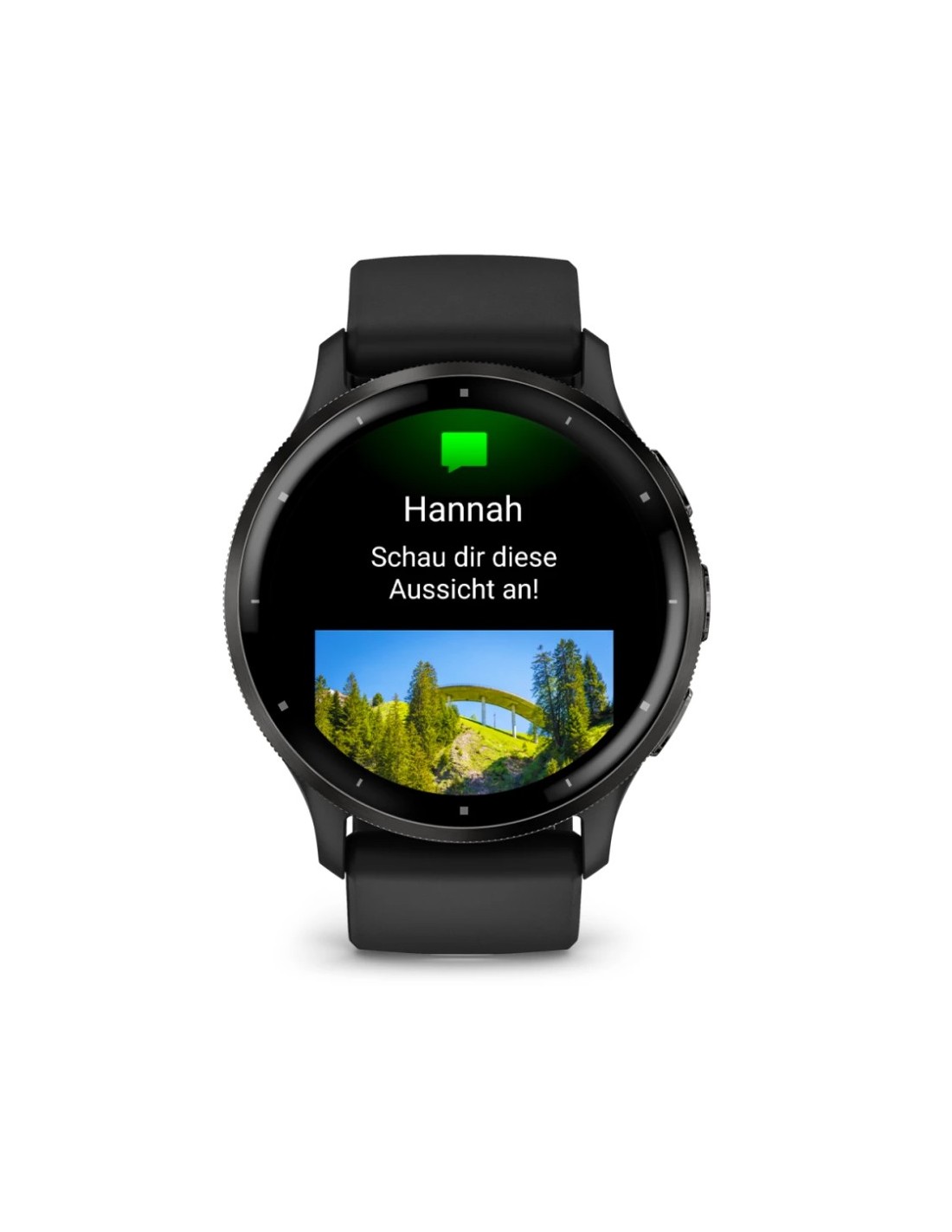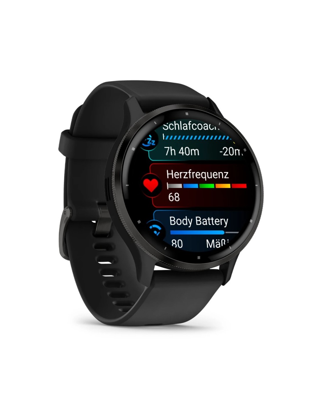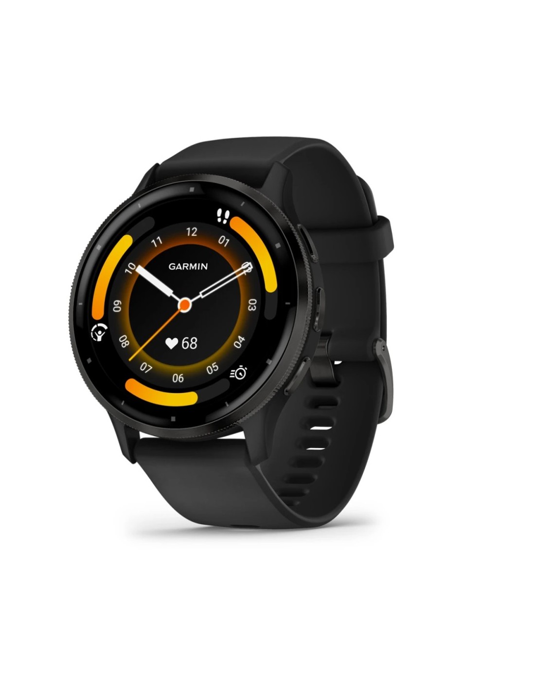 Garmin Venu 3. Diagonal de la pantalla: 3,56 cm (1.4"), Tecnología de visualización: AMOLED, Resolución de la pantalla: 454 x 454 Pixeles, Pantalla táctil. Wifi. GPS (satélite). Peso: 46 g. Material de la banda: Silicona, Color de banda: Negro, Gris